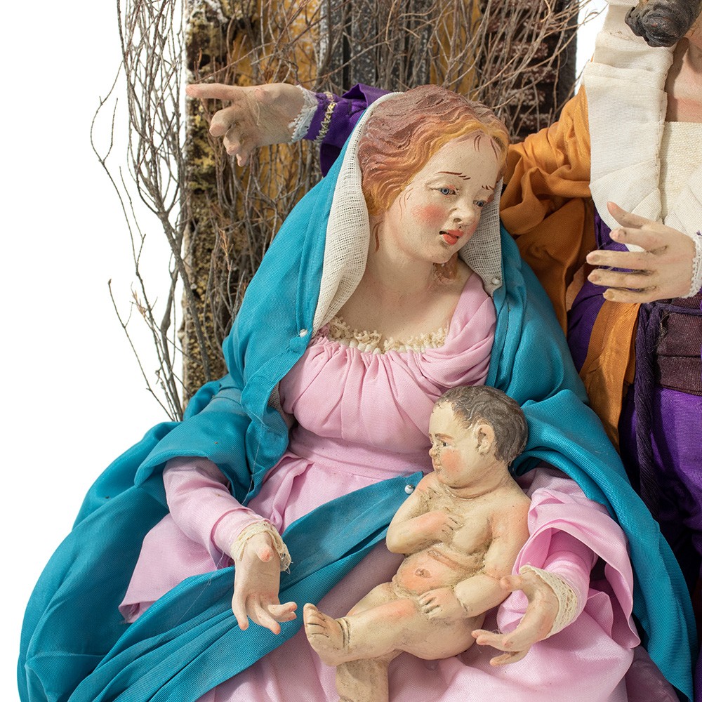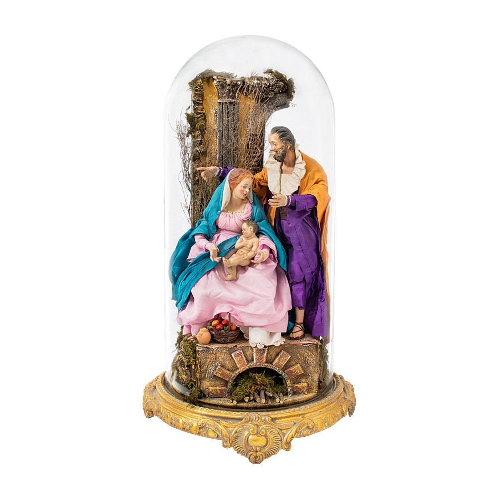 The Holy Family is placed on a round base – with a diameter of 30 cm – in gold leaf wood. The figures are entirely handcrafted in terracotta with fabric clothing and glass eyes. The setting is made of wood and cork.