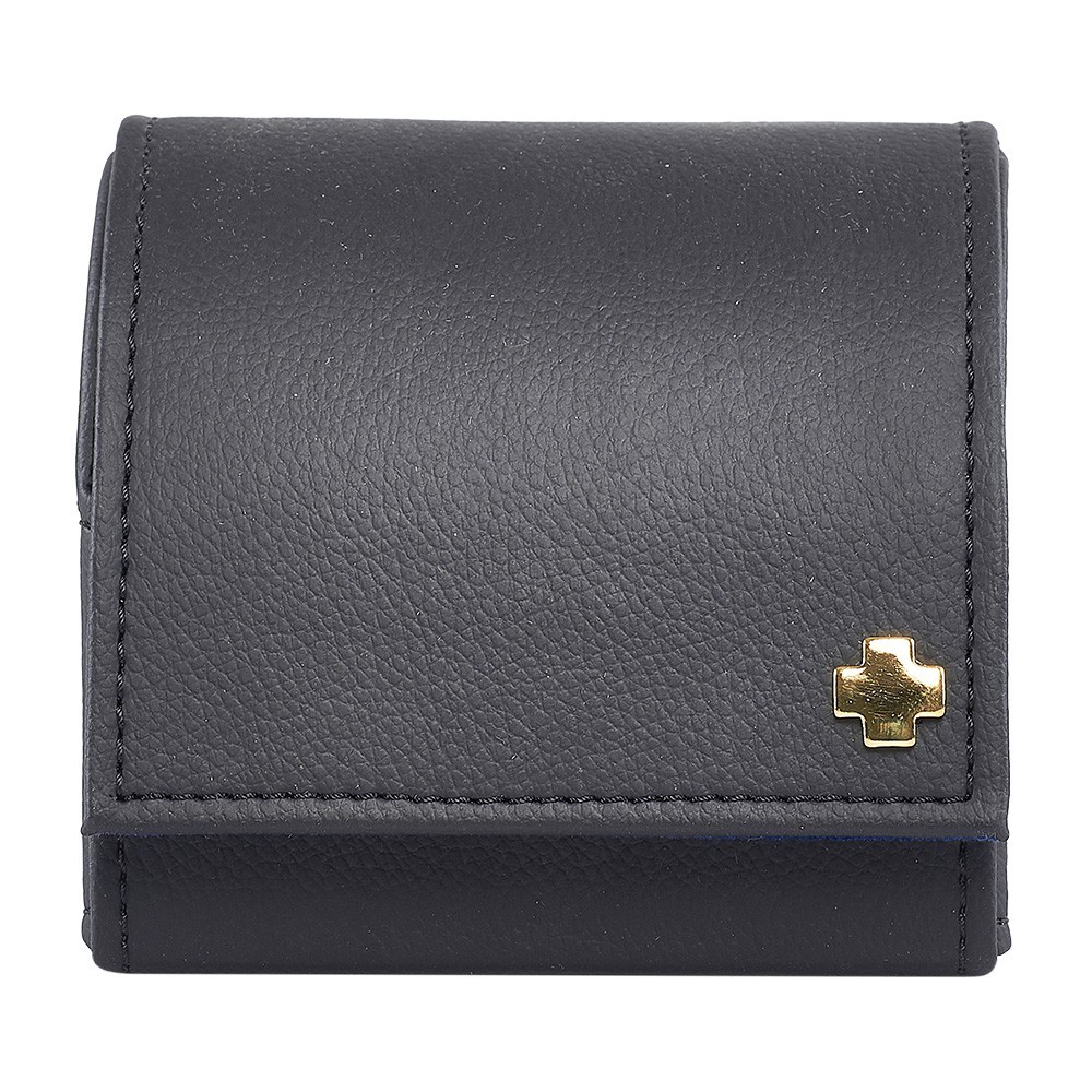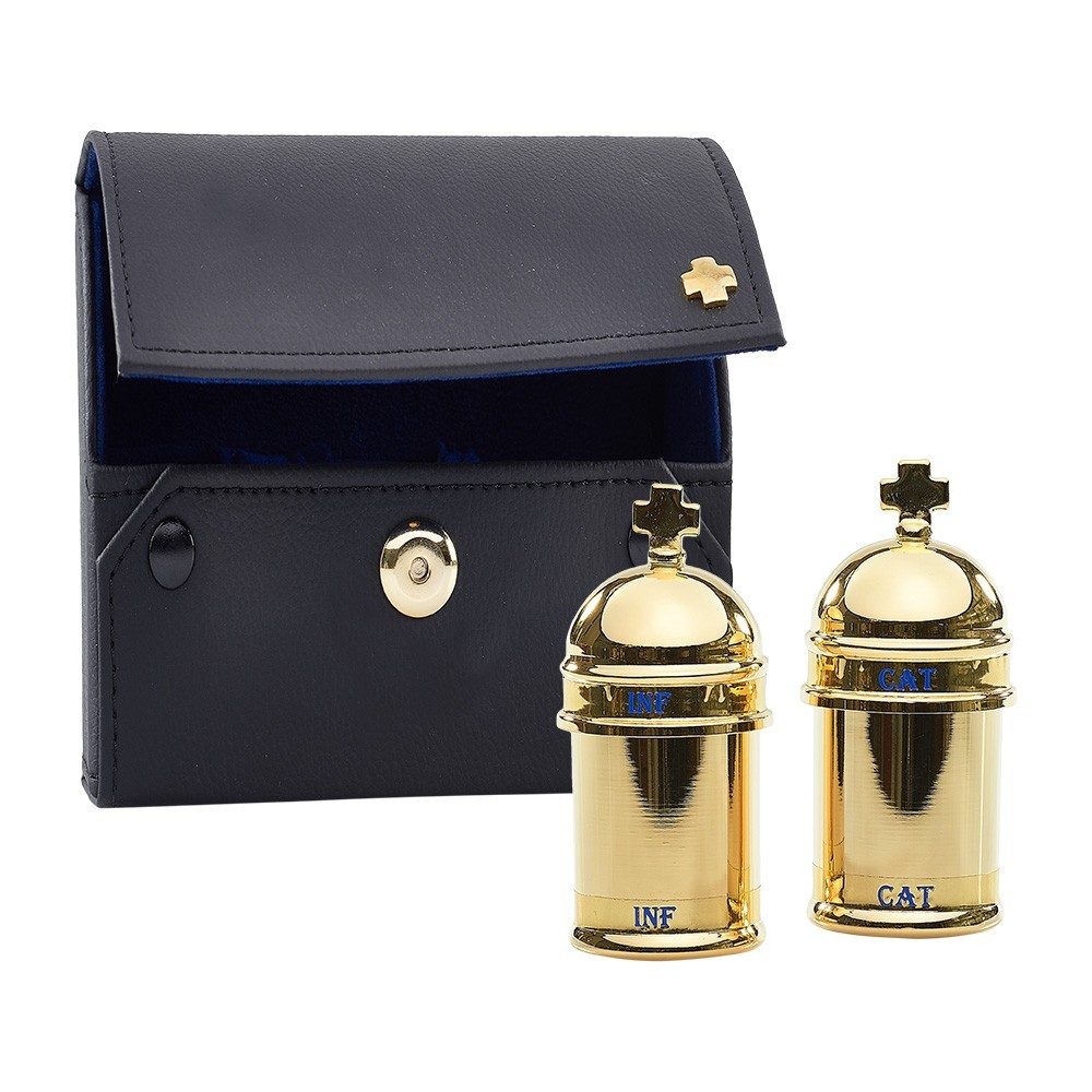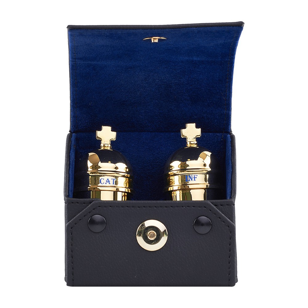 Case with two holy oil stocks (Catechumens and Oil of the Sick) in gold metal. The interior of the stocks is made of removable glass. They feature caps with a flat cross. >The case is black and has a clip closure.
