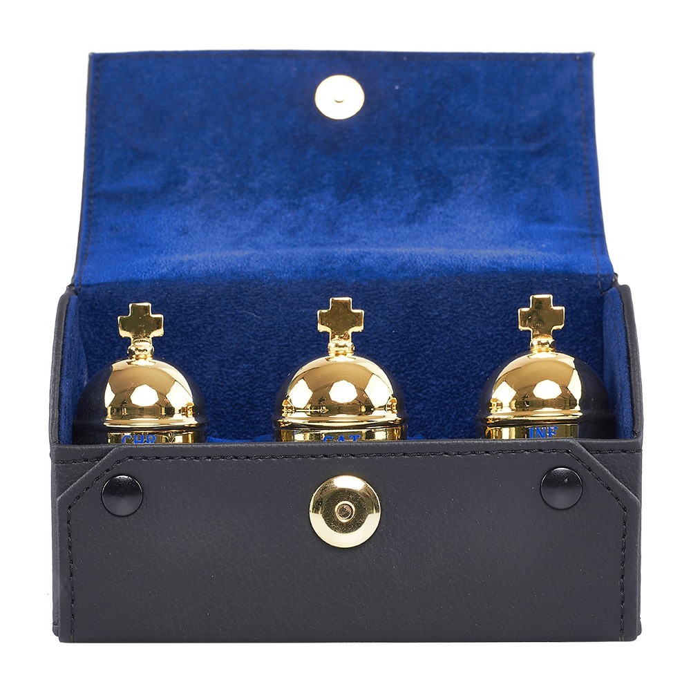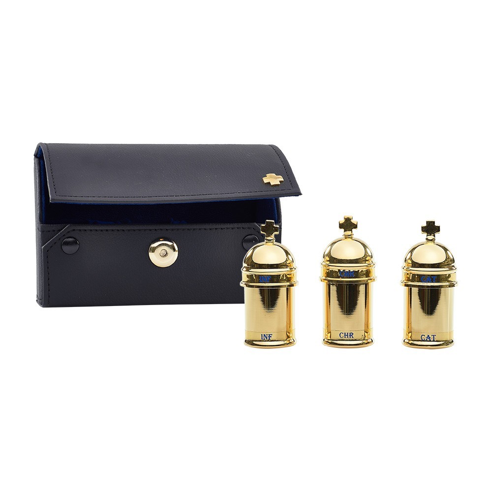 Case with three holy oil stocks (CAT and CHR). The stocks are made of golden brass. The interior is made of removable glass. They feature caps with a flat cross. The case is black with clip closure.