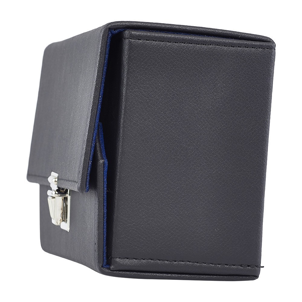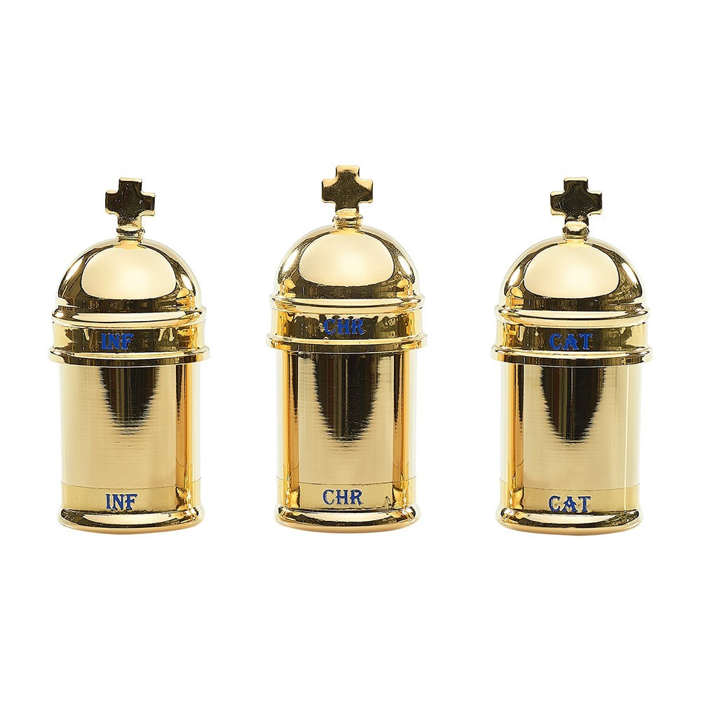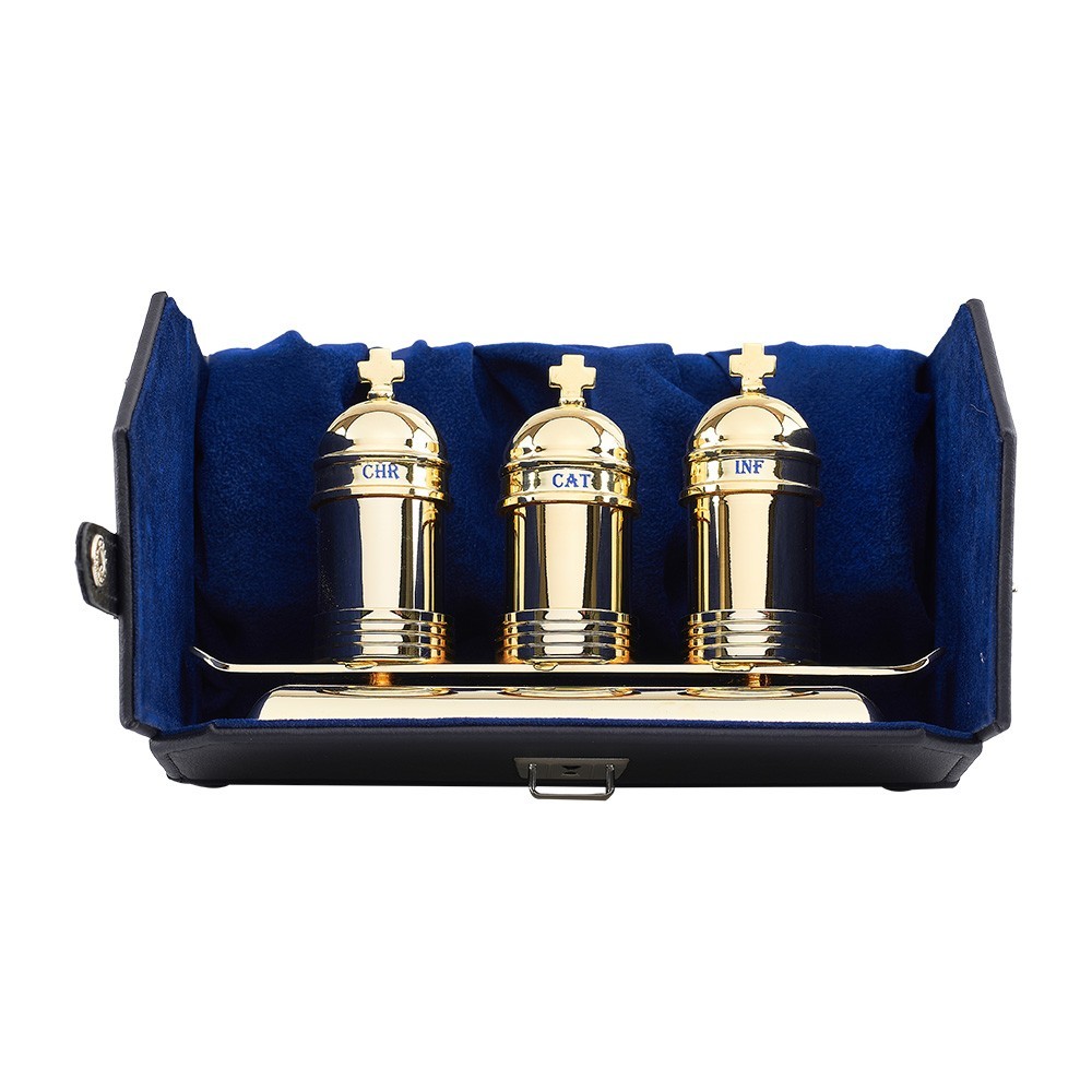Case with three holy oil stocks (CAT, INF, CHR) on a tray. The tray and stocks are made of golden brass. The interior is made of removable glass. They feature caps with a flat cross. The case is black and has a clip closure.