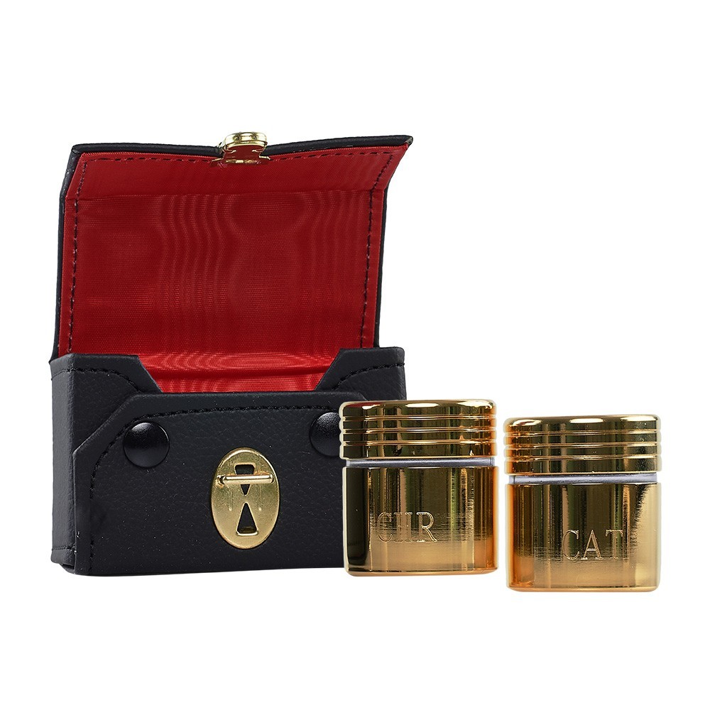 Pouch with two jars for holy oils (CAT and CHR). The pouch is made of black leatherette with red fabric lining. The jars are made of gold metal.