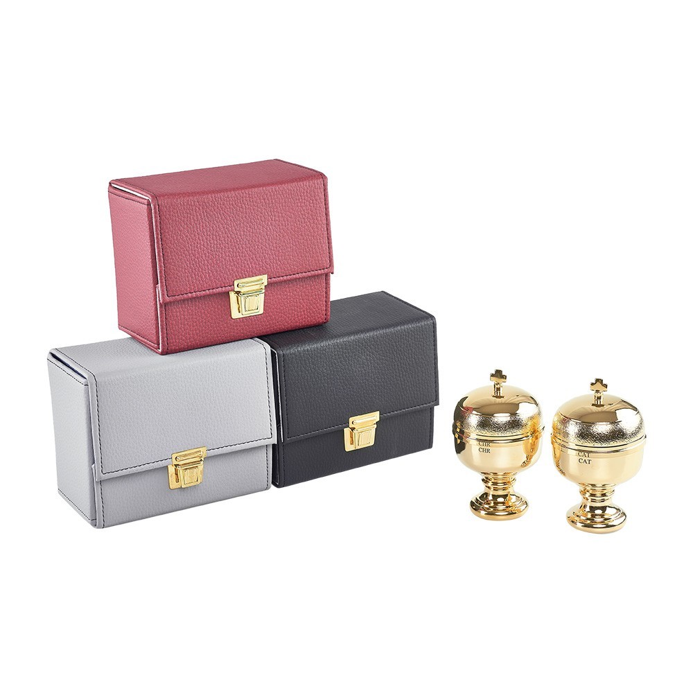 Chrism holy oil stocks complete with colored case. Available in the following colors: burgundy, white and black. The exterior of the jar is made of gold-plated metal and the interior is made of glass.