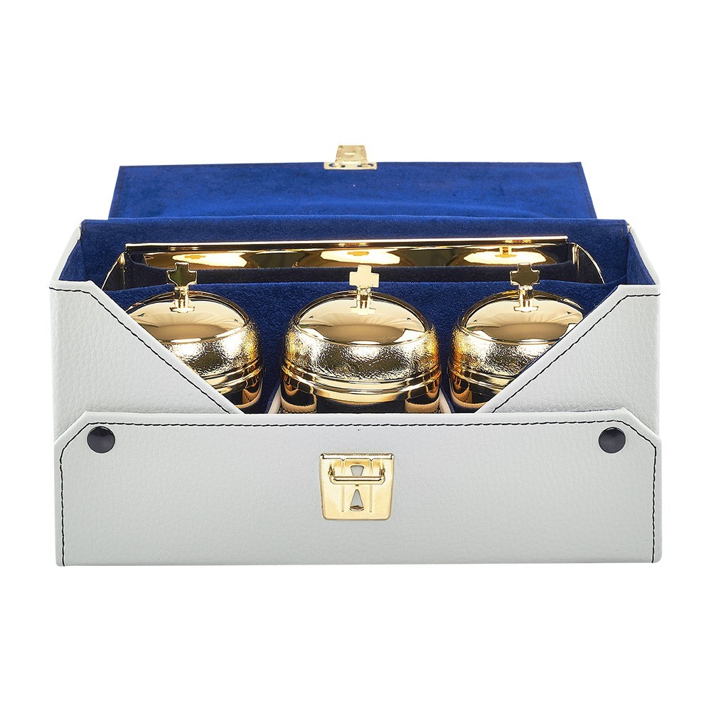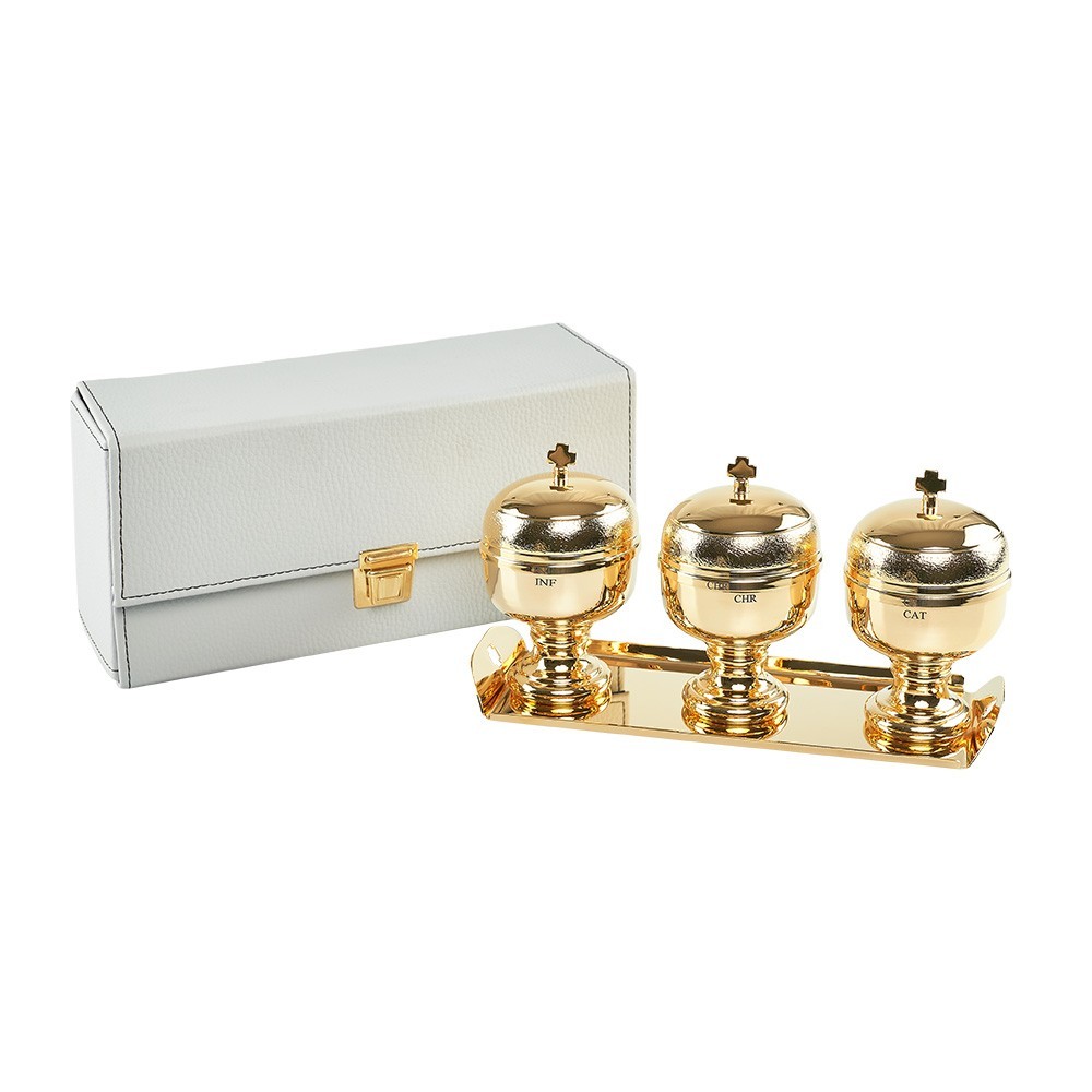 Tre jars for INF, CAT, CHR holy oils, Ø 4 cm. Made of gold-plated aluminium.