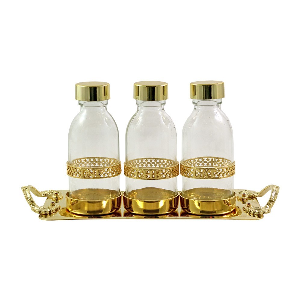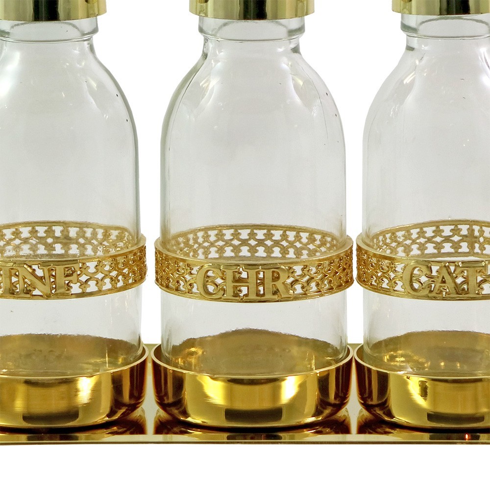 This liturgical set is made up of a 24k golden brass tray and three bottles for holy oils with gold-plated ferrule (INF- CHR- CAT).