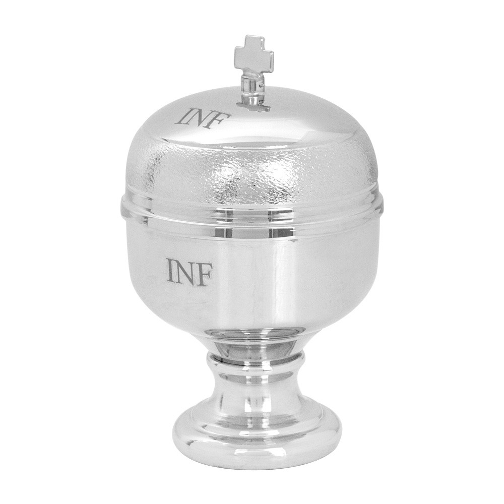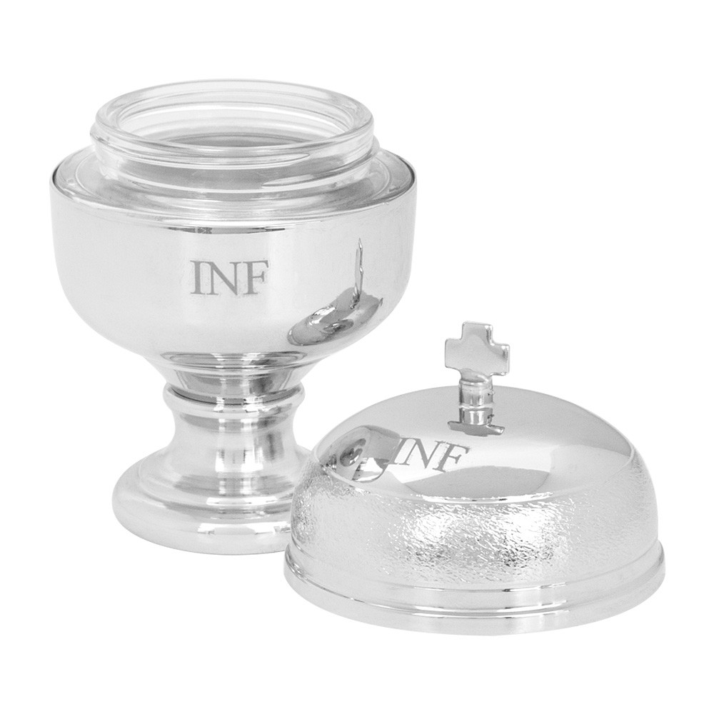 Holy oil container for Oil of the Sick made of silverplated metal with glass interior.