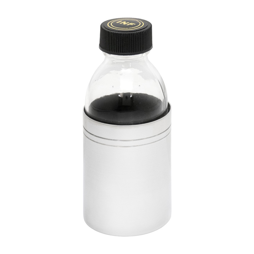 Made of silver-plated metal with glass interior. Capacity 50 cc.