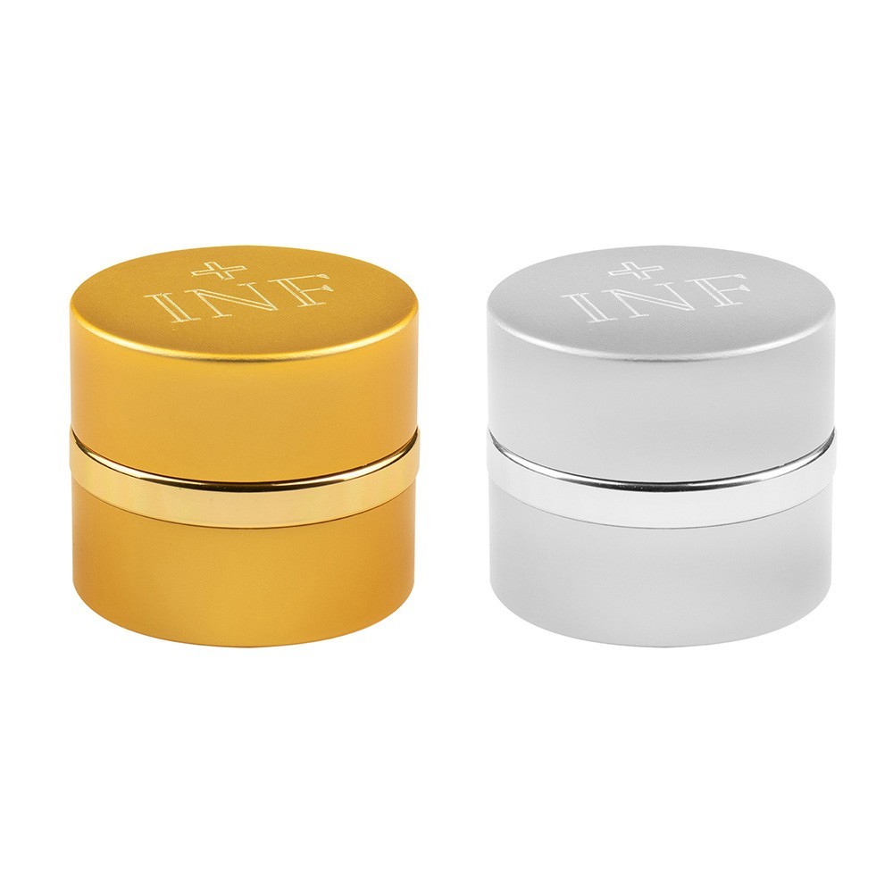 Holy oils bottle for oil of the sick, diameter approx. 5 cm. These bottles are made of gold and silver aluminum. The interior is made of white ceramic with hermetic closure. Engraving on the top with small cross and INF writing.