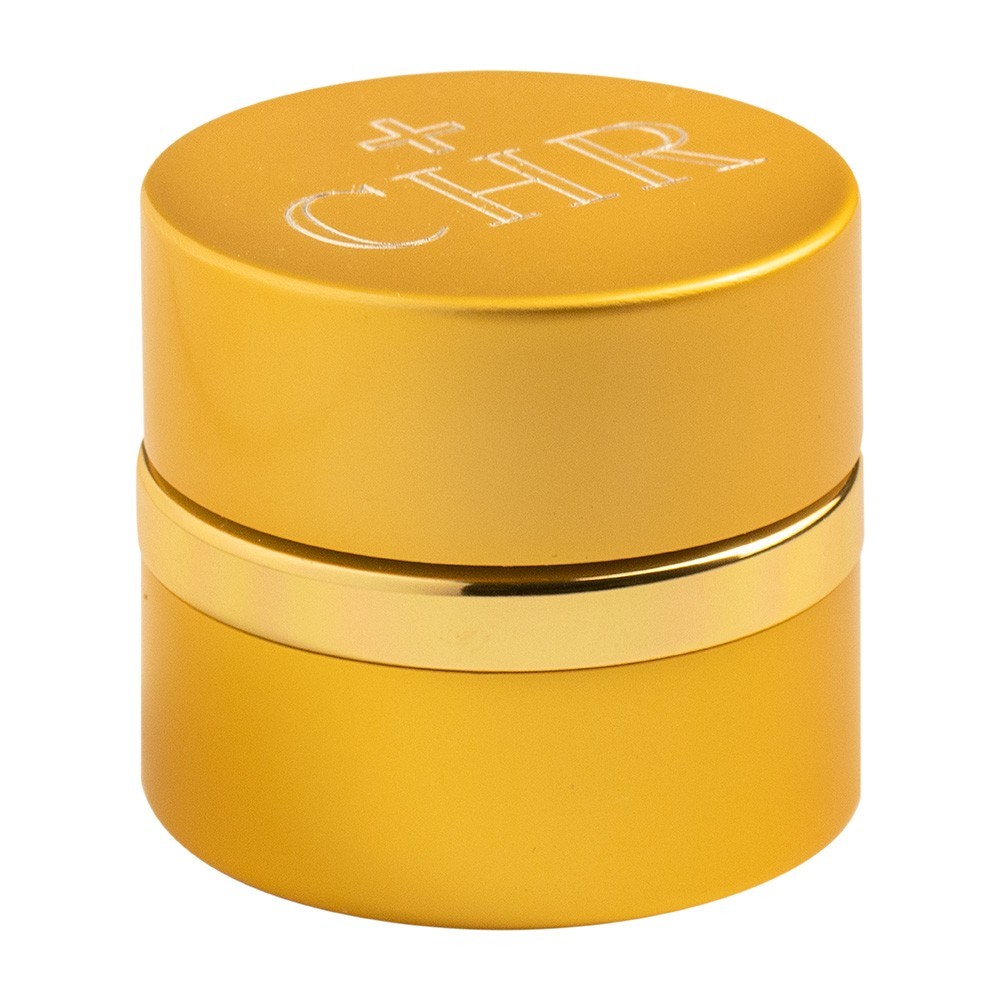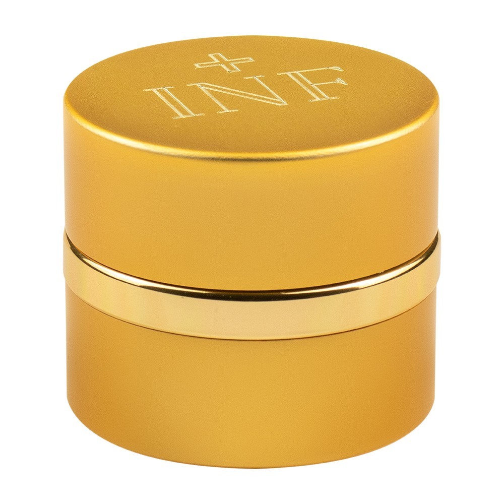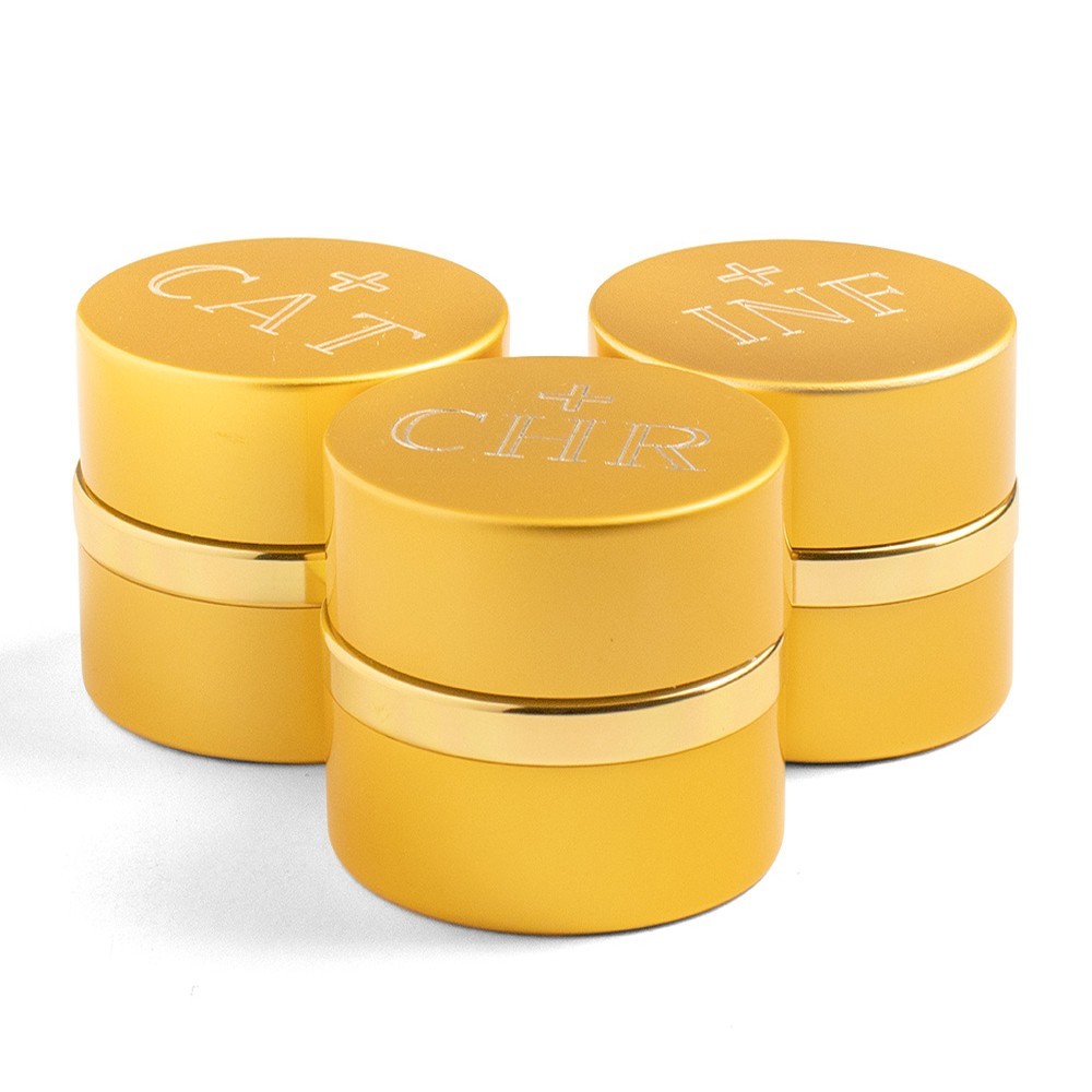 Complete set of three jars for Holy oil of the Sick, Catechumens and Chrism. The jars are made of gold-plated aluminium. They are round and have a diameter of 4 cm. The inside is made of white ceramic glass with hermetic closure. Each cap features an engraving of a small cross and the INF, CAT, CHR initial.