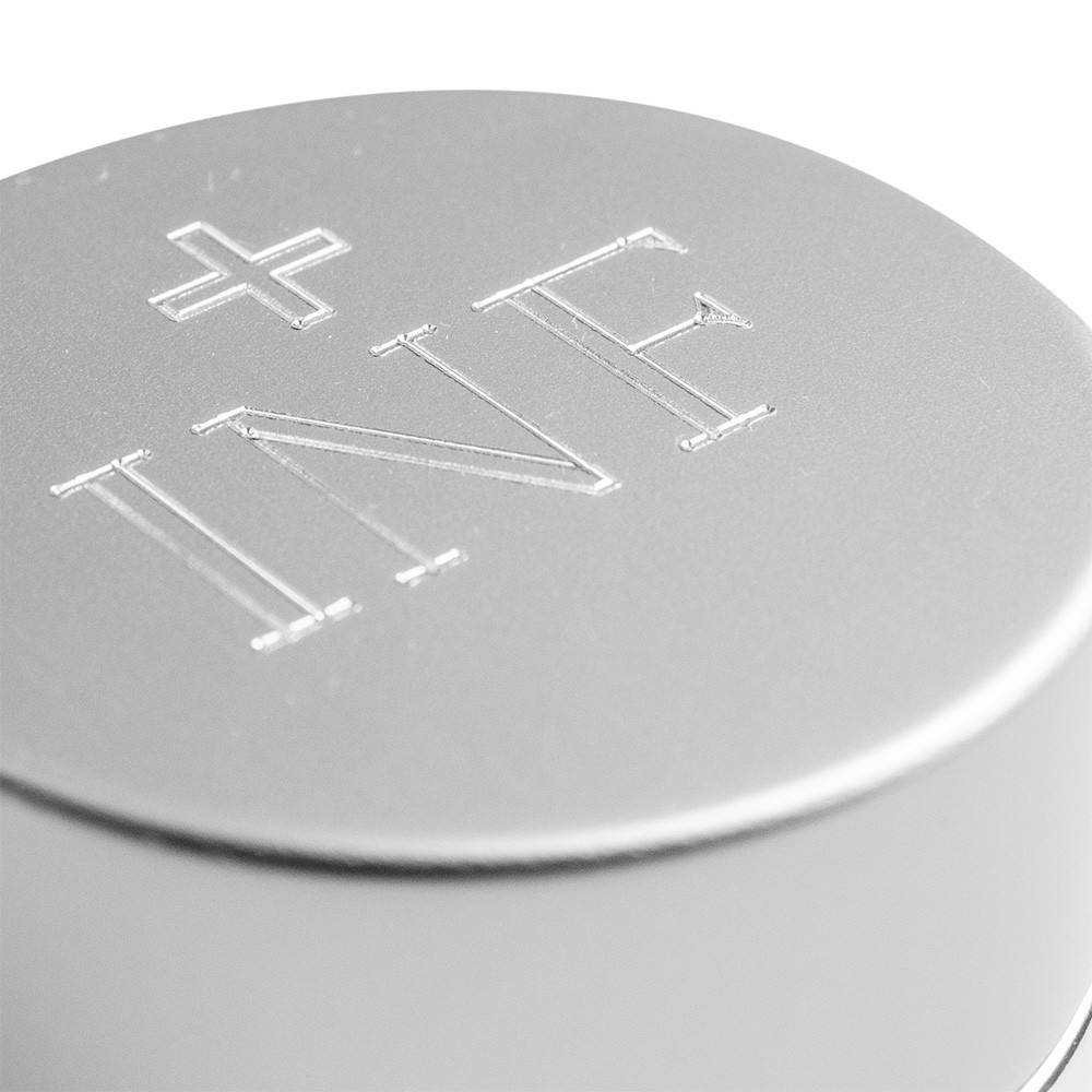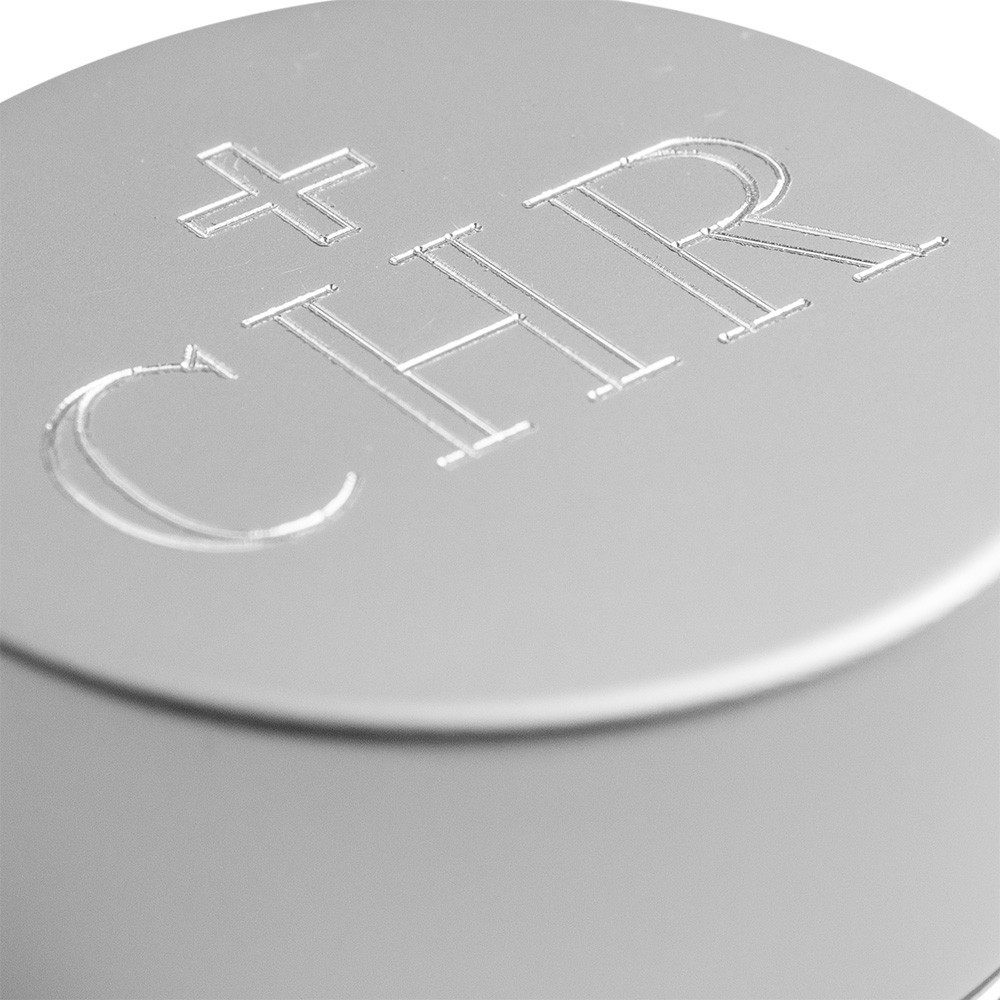 The stocks are made of silver-plated aluminium. They are round and have a diameter of 4 cm. The inside is made of white ceramic glass with hermetic closure. Each cap features an engraving of a small cross and the INF/CAT/CHR initial.