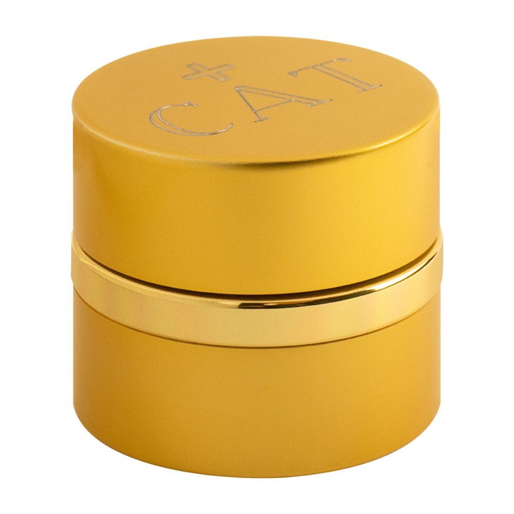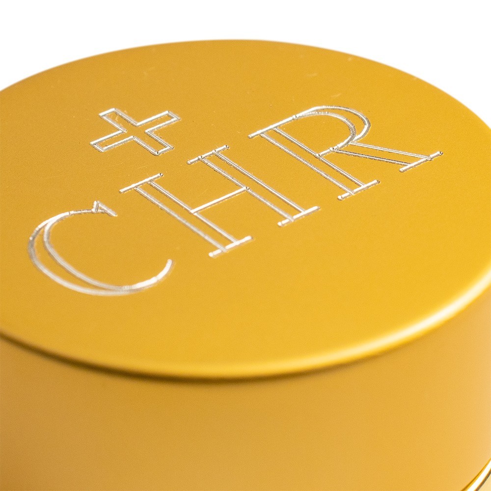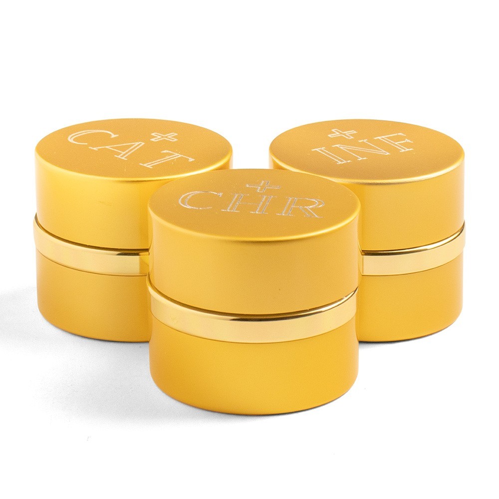 Tre jars for INF, CAT, CHR holy oils, Ø 4 cm. Made of gold-plated aluminium.