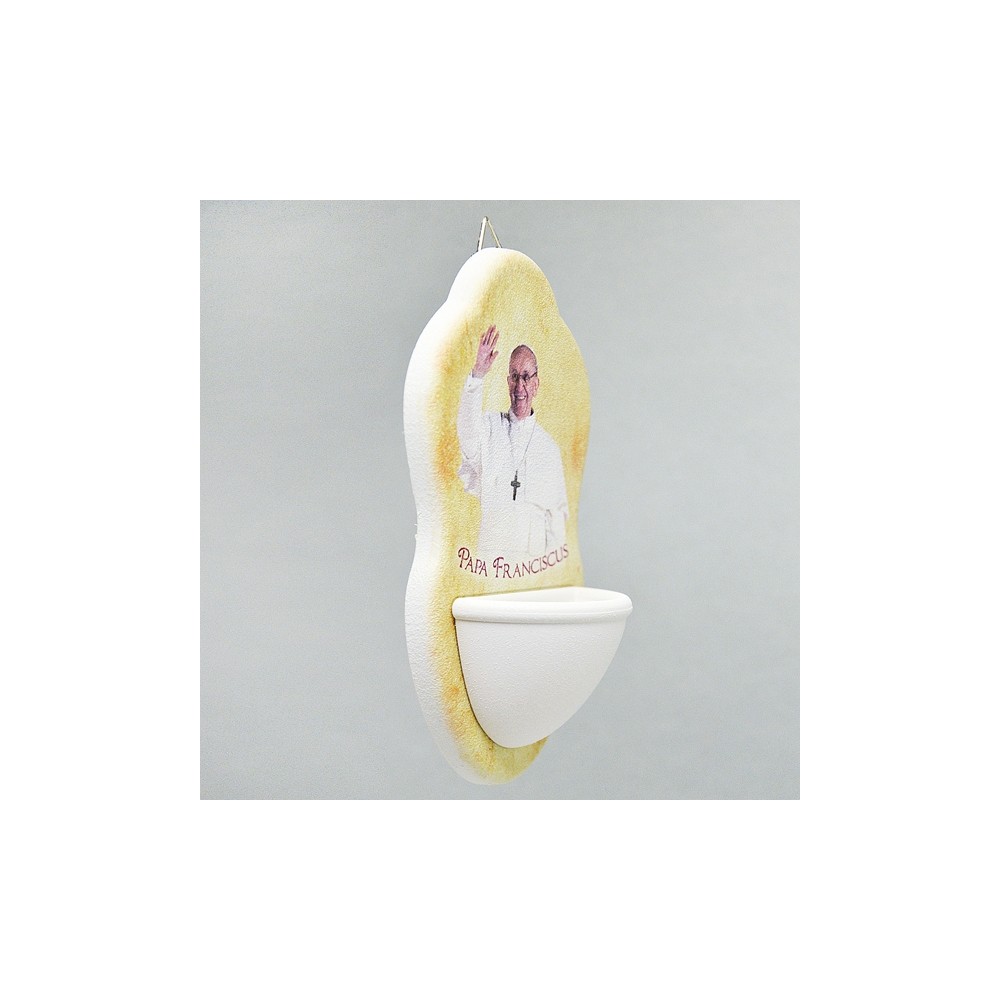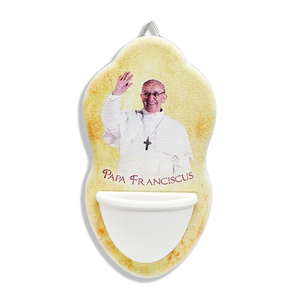Holy water font with natural stone look. It features the image of Pope Francis. Supplied in a box. Excellent gift idea.