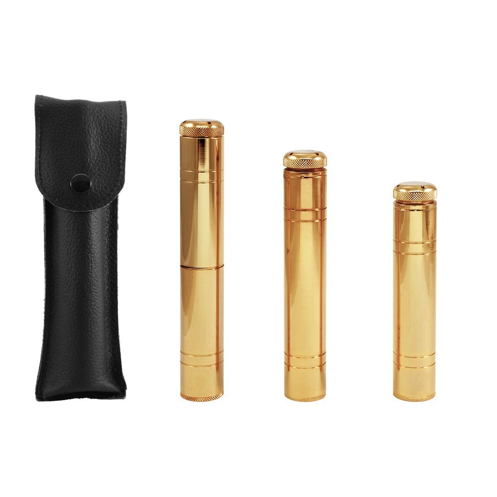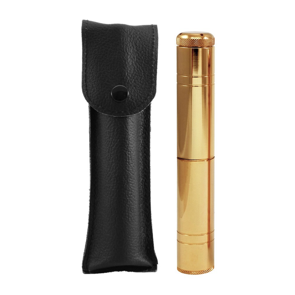 The case is made of real leather, whereas the aspergillum is made of brass with gold finish.