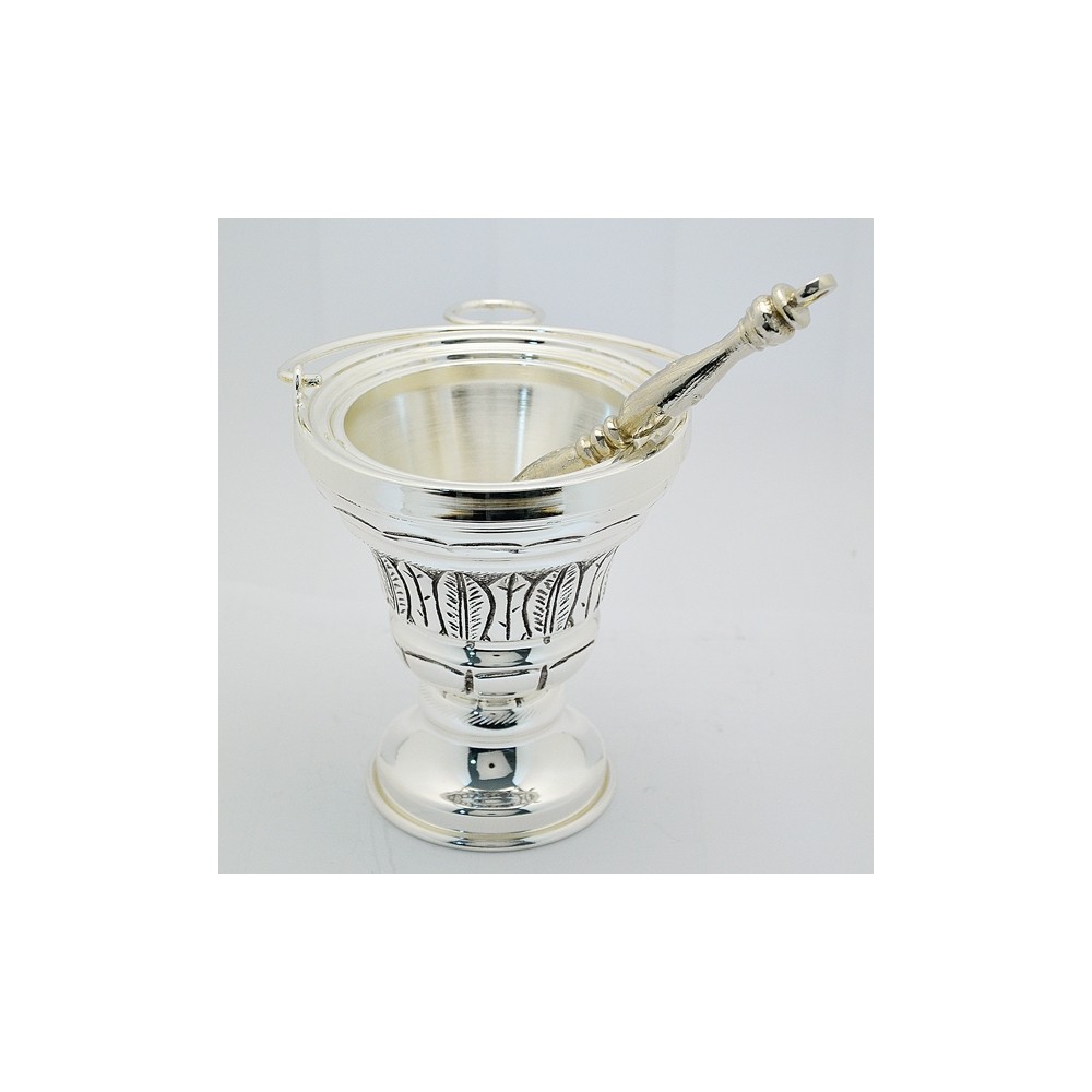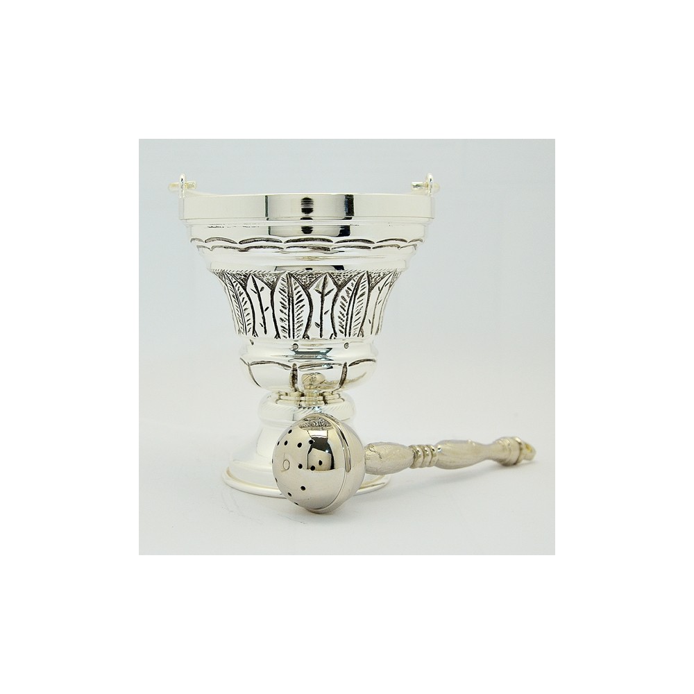 Holy water pot in silver-plated brass chased by hand by expert chisellers. Complete with sprinkler. It can be matched with a thurible.