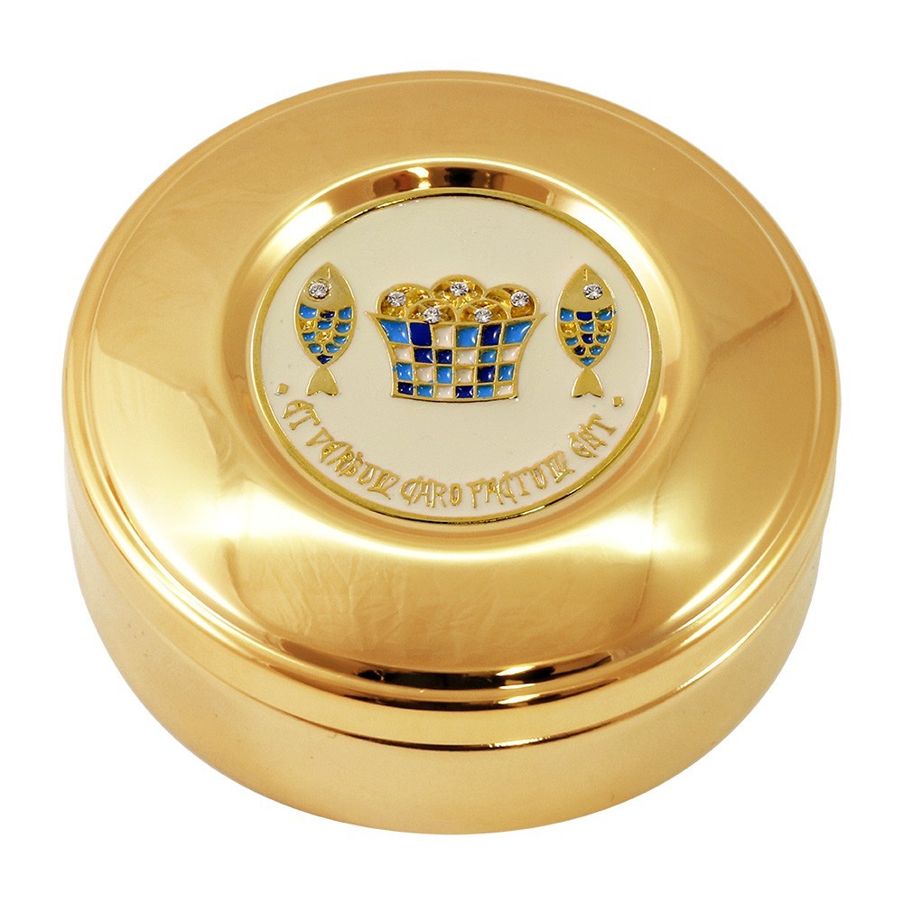This host pyx features an enameled plaque with ‘Bread and fish’ engraving. It’s made of gold-plated brass and is enriched with clear rhinestones. This pyx is 2.5 cm tall and has a diameter of 8.4 cm.