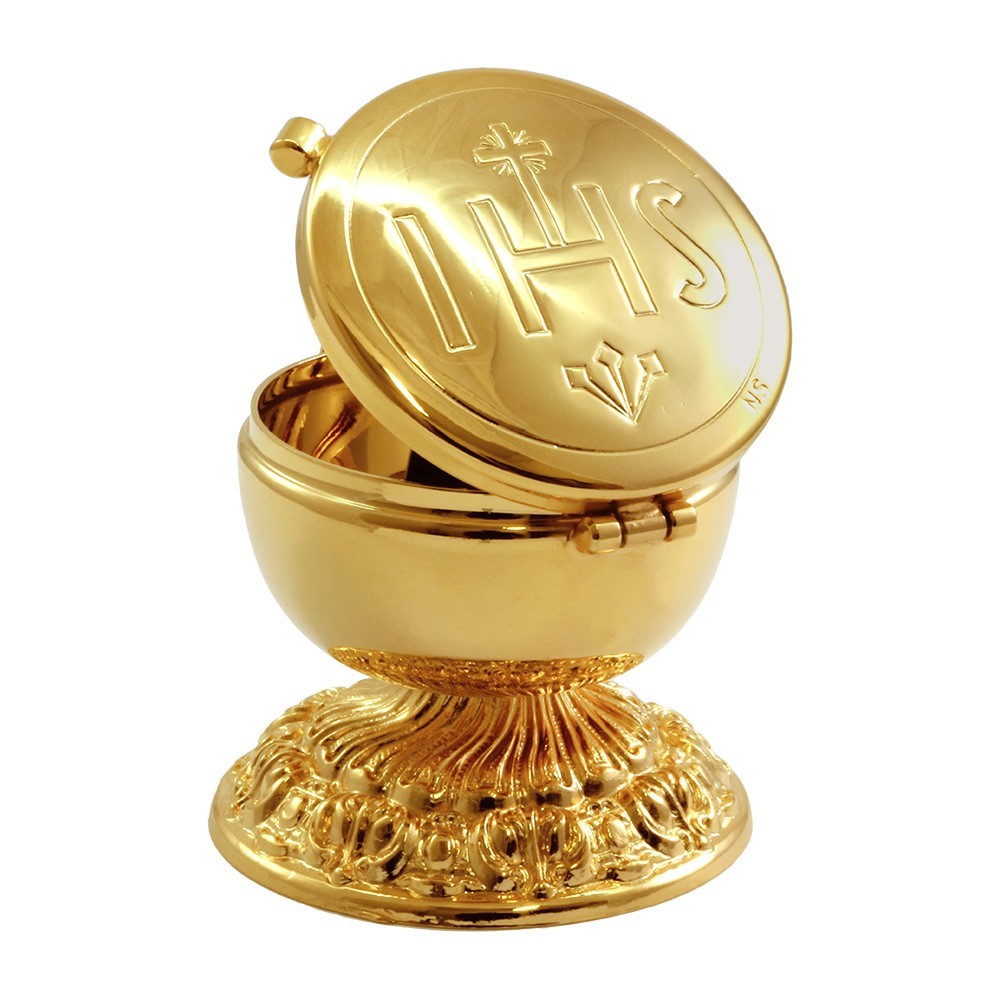 Pyx for hosts with JHS engraving. It has a base that was made by using a particular casting technique.