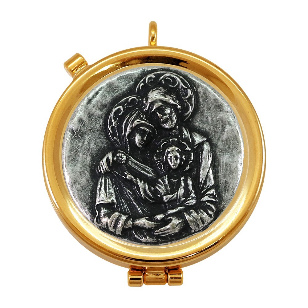 Host case in 24k golden brass with plaque in relief depicting the Holy Family. The plaque has an antique silver finish. The Pyx has a ring that allows to wear it around the neck and can contain about 12 hosts.