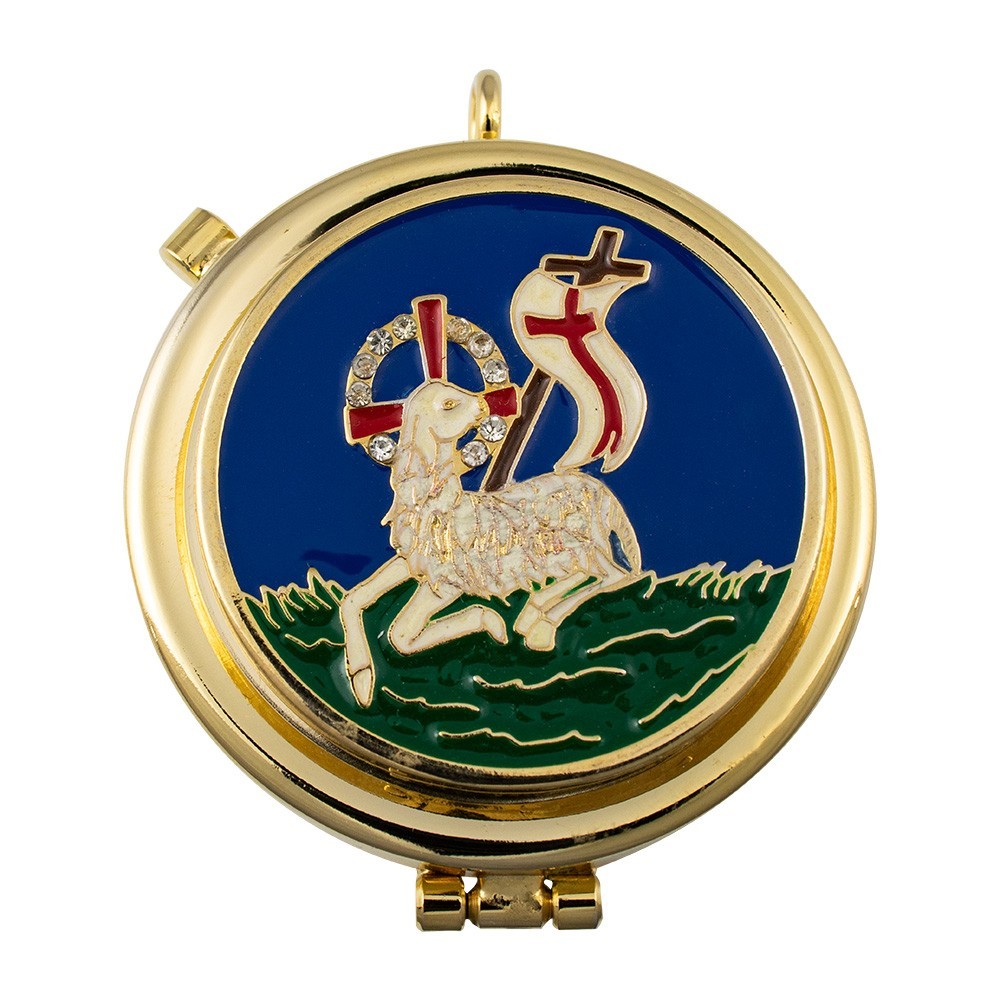 Pyx in 24k golden brass with enamel. Embellished with image of the Lamb of Peace and rhinestones. Complete with ring that allows to wear it around your neck. Complete with box. The production is entirely made in Italy.
