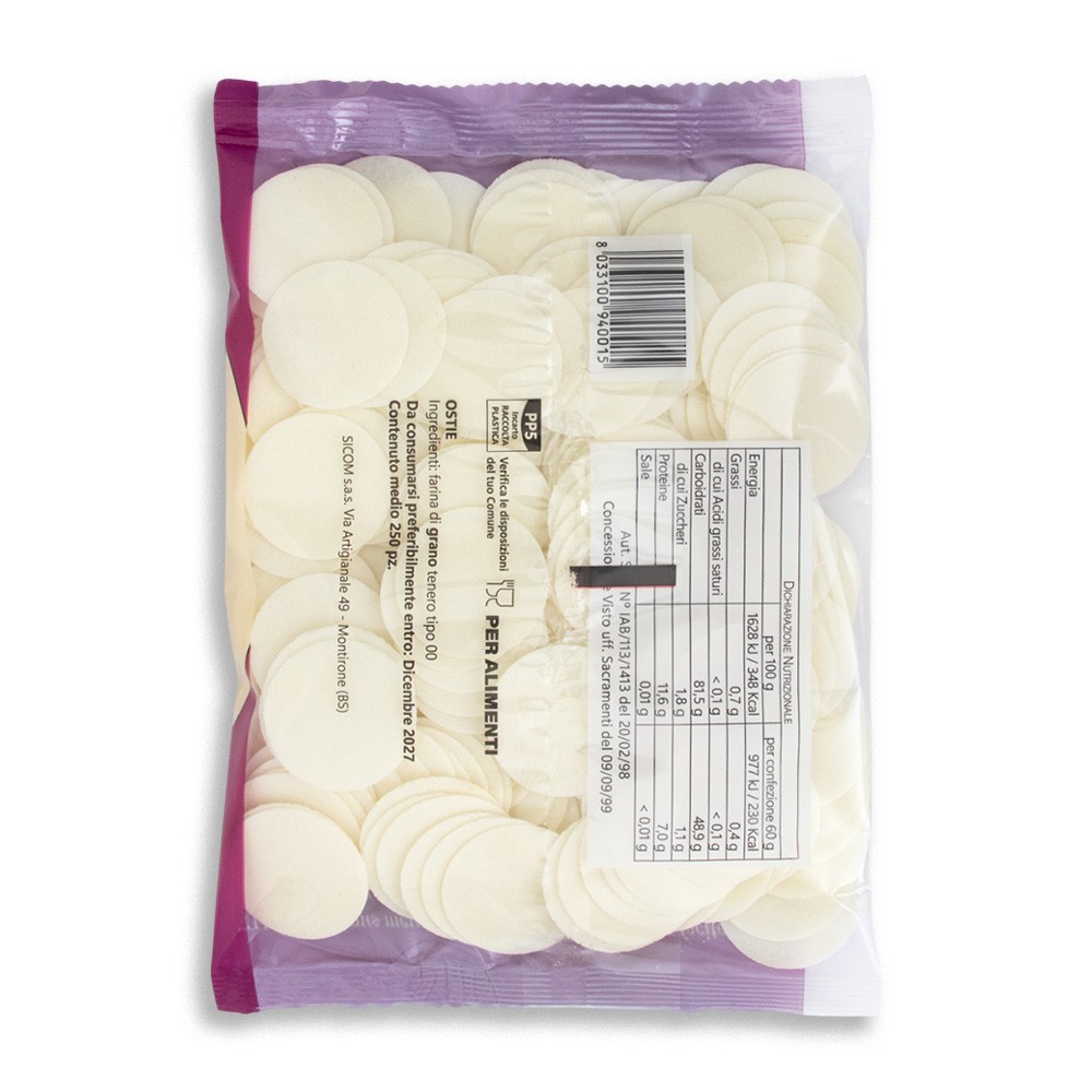 These thin white wafers, with a diameter of 3.5 cm, are made in Italy in compliance with liturgical and food safety standards, ensuring the highest quality and safety.
