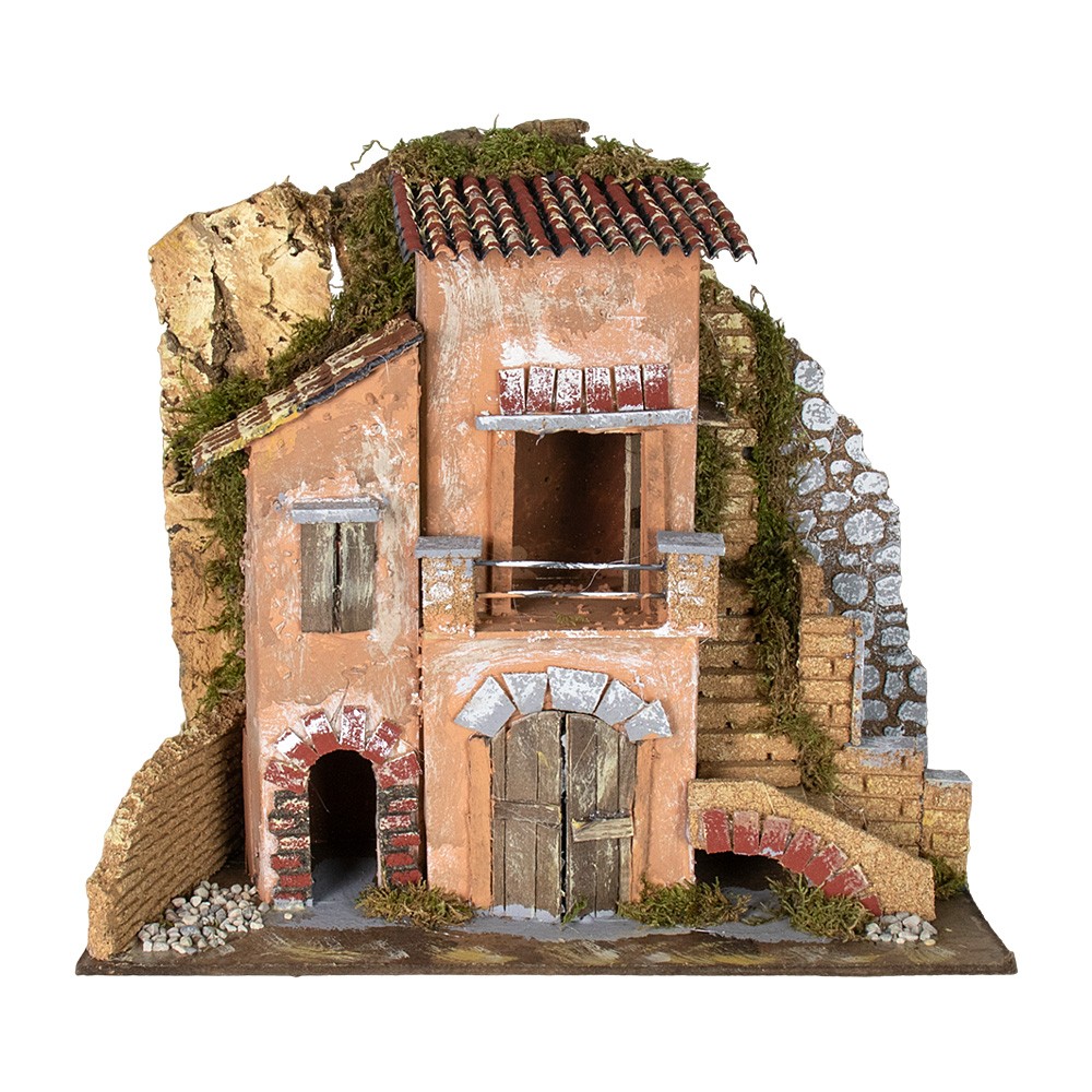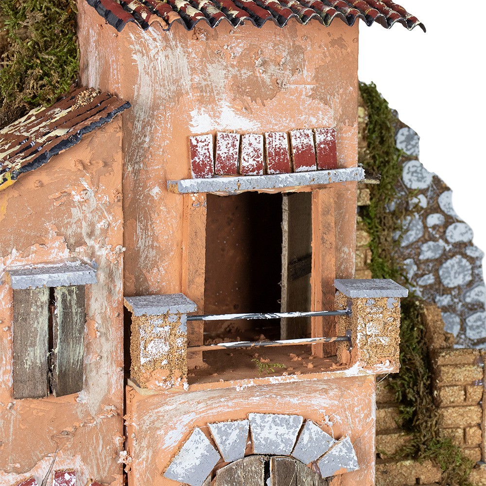 Lovely nativity setting with base in wood, carboard houses, staircase and rock made of cork, enriched with real moss.