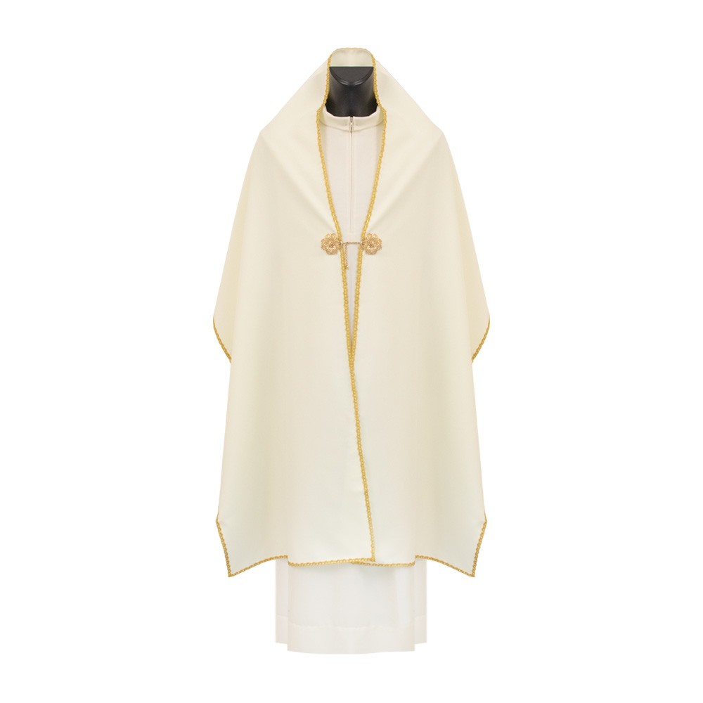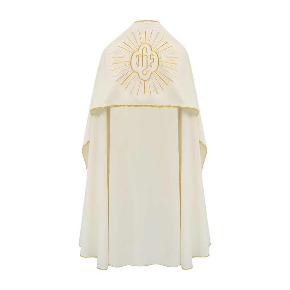 This liturgical vestment features a golden embroidery of the JHS symbol surrounded by rays. It closes with a clasp in golden metal. Along the edges of the chasuble is a golden bias tape which completes the stitching.