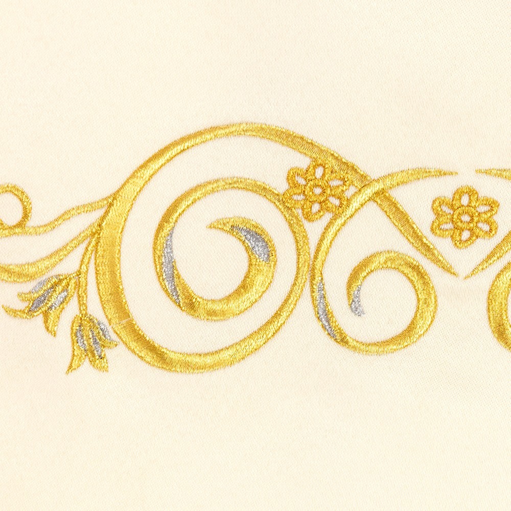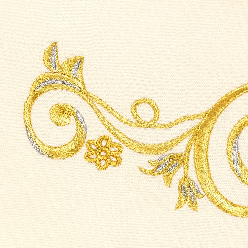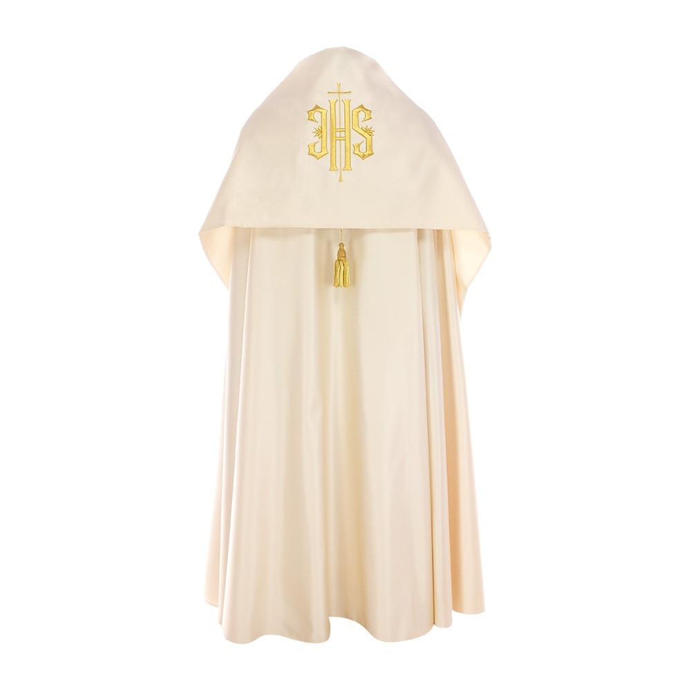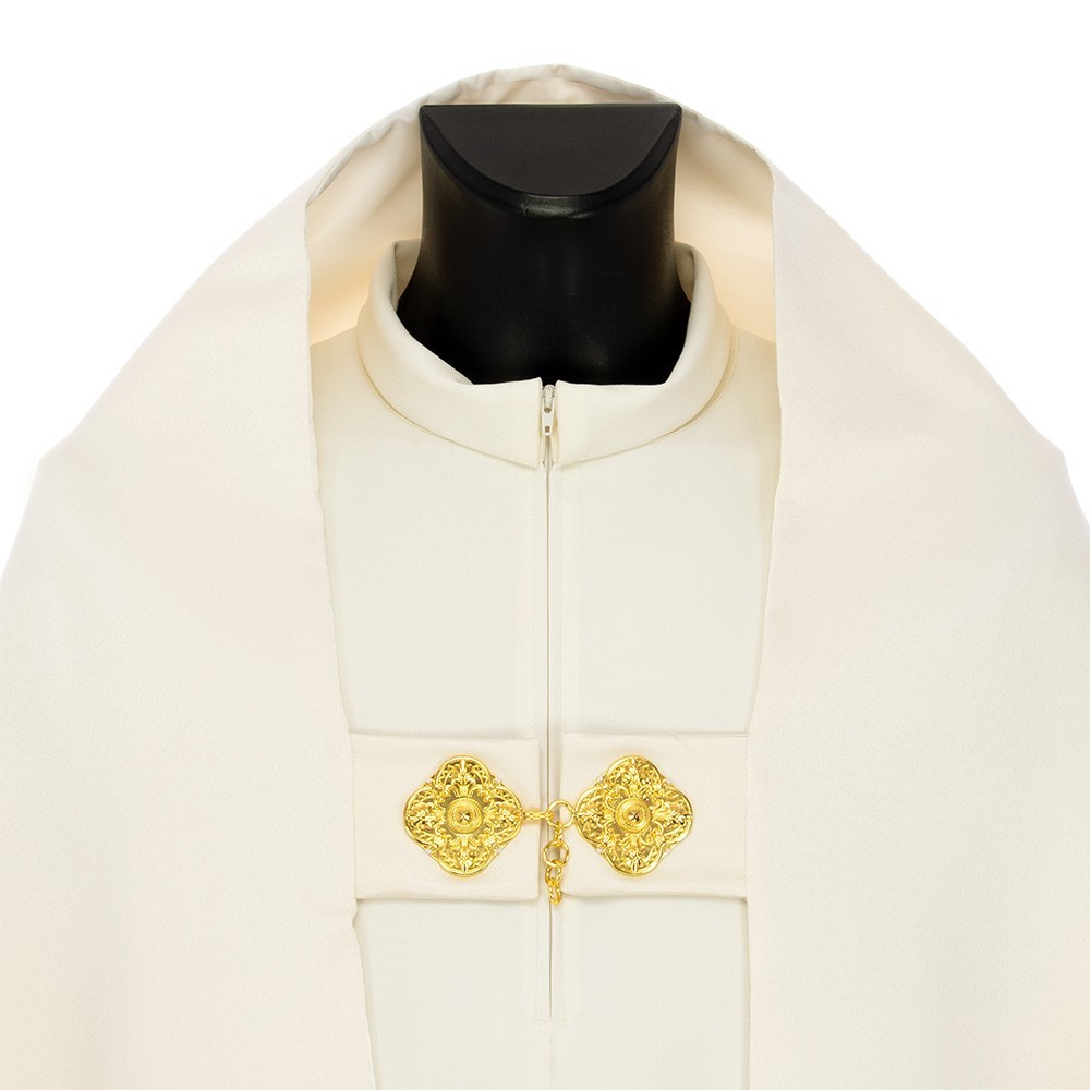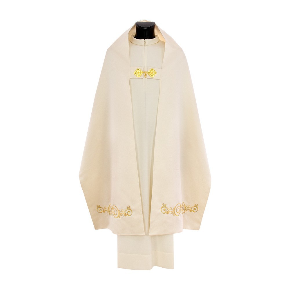 Made of polyester fabric. Provided with clasp in gold-plated brass and pockets with inner lining. This vestment is made by a Polish company using fine fabrics and manufacturing techniques.