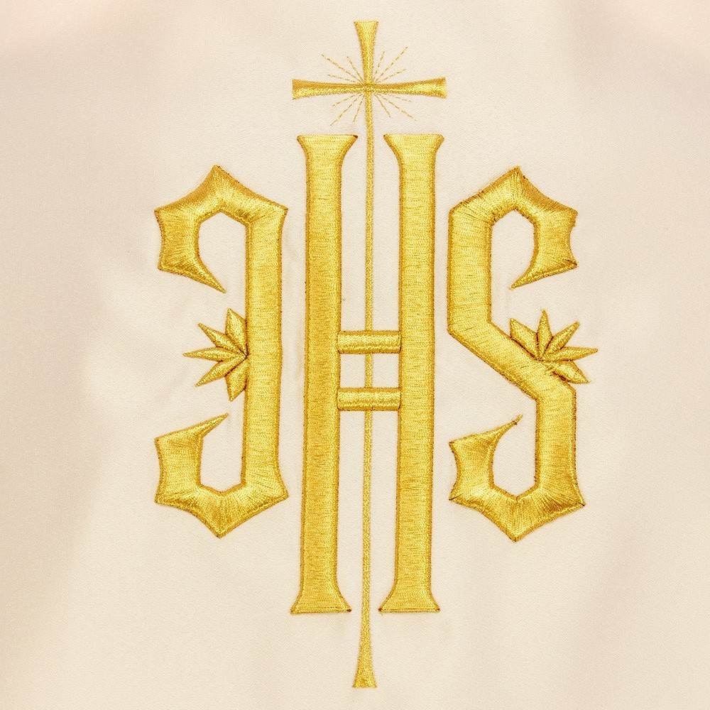 Humeral veil of ecru ivory color with JHS golden embroidery made by machine with great care and precision.