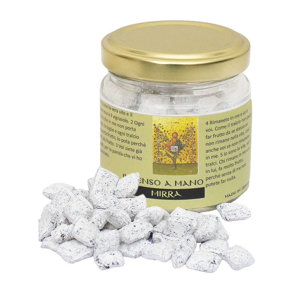Church incense from Mount Athos with MYRRH fragrance; supplied in a glass jar.