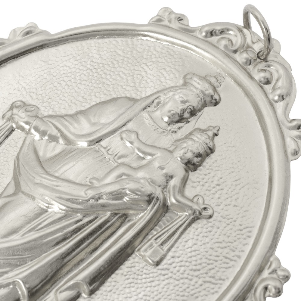 Made of aluminium and silver-plated brass with embossed image of Our Lady.
