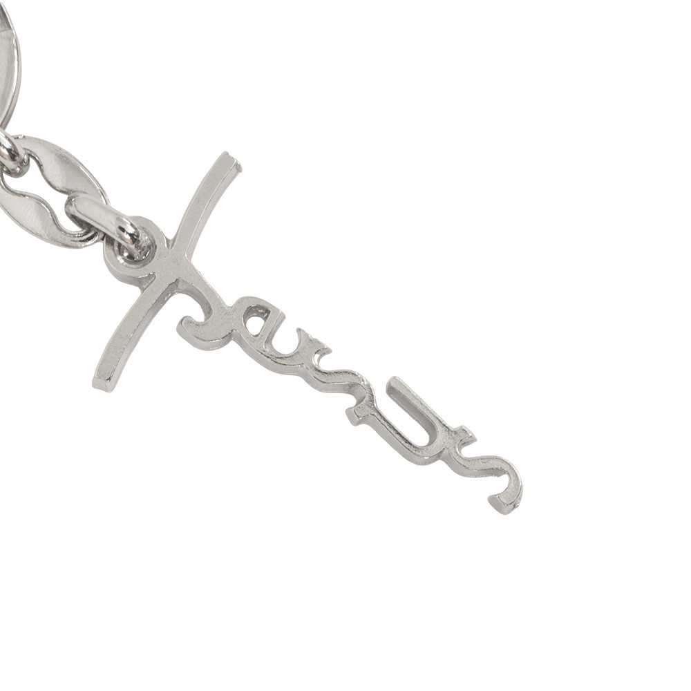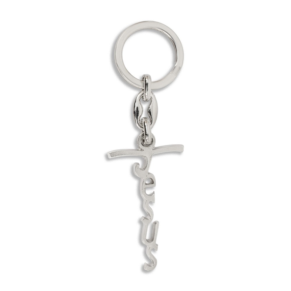 Keychain with JESUS writing in the shape of a cross. Entirely made of silver-plated metal.