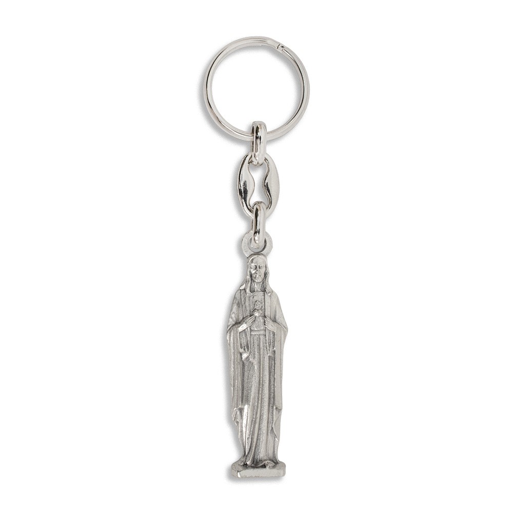 Keychain in the shape of a mini statue of the Sacred Heart of Jesus with a ring hook. Entirely made of silver-plated metal.