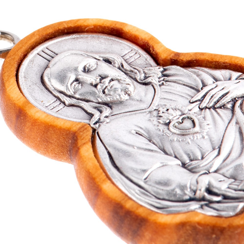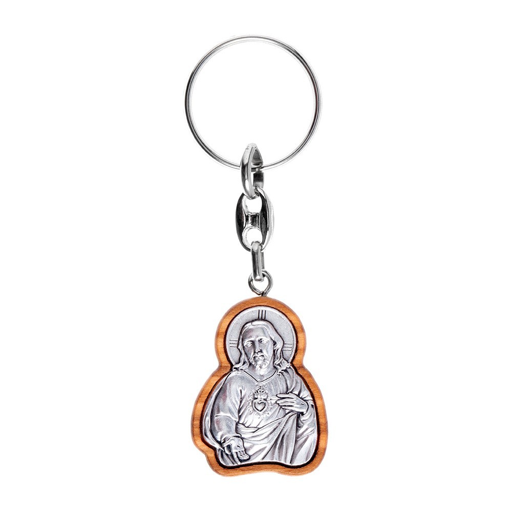 Shaped keychain in olive wood with metal plaque depicting the Sacred Heart of Jesus embossed.