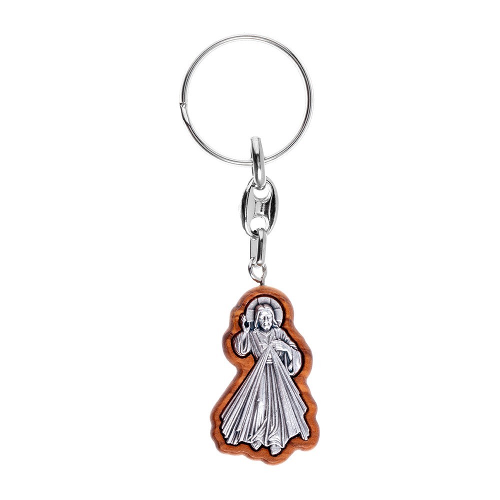 Keychain Divine Mercy Jesus made of shaped olive wood with metal plaque depicting Jesus in relief.