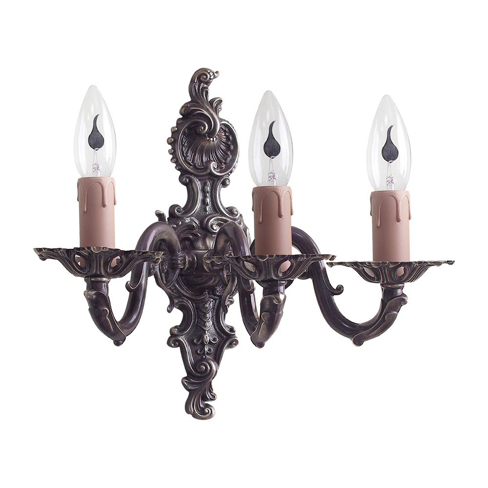 Wall lamp in Baroque style made of brass with antique finish. Complete with candle casings of 2 cm diameter. The lamps are not included (do not use light bulbs with an electricity absorption greater than 40W).