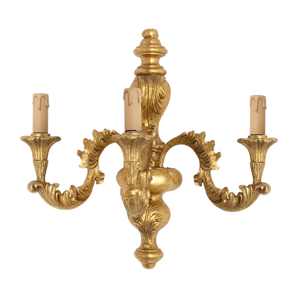 Entirely crafted from wood with a gold and antiqued finish, featuring three ivory-colored plastic candle holders with a 2.5 cm diameter. Bulbs are not included.
