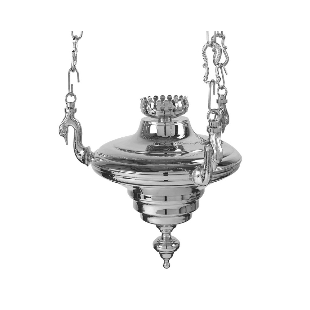 Hanging lamp with wall mount. This Sanctuary lamp is made of nickel-plated brass. It’s suitable to be used with liquid wax. Complete with chains.