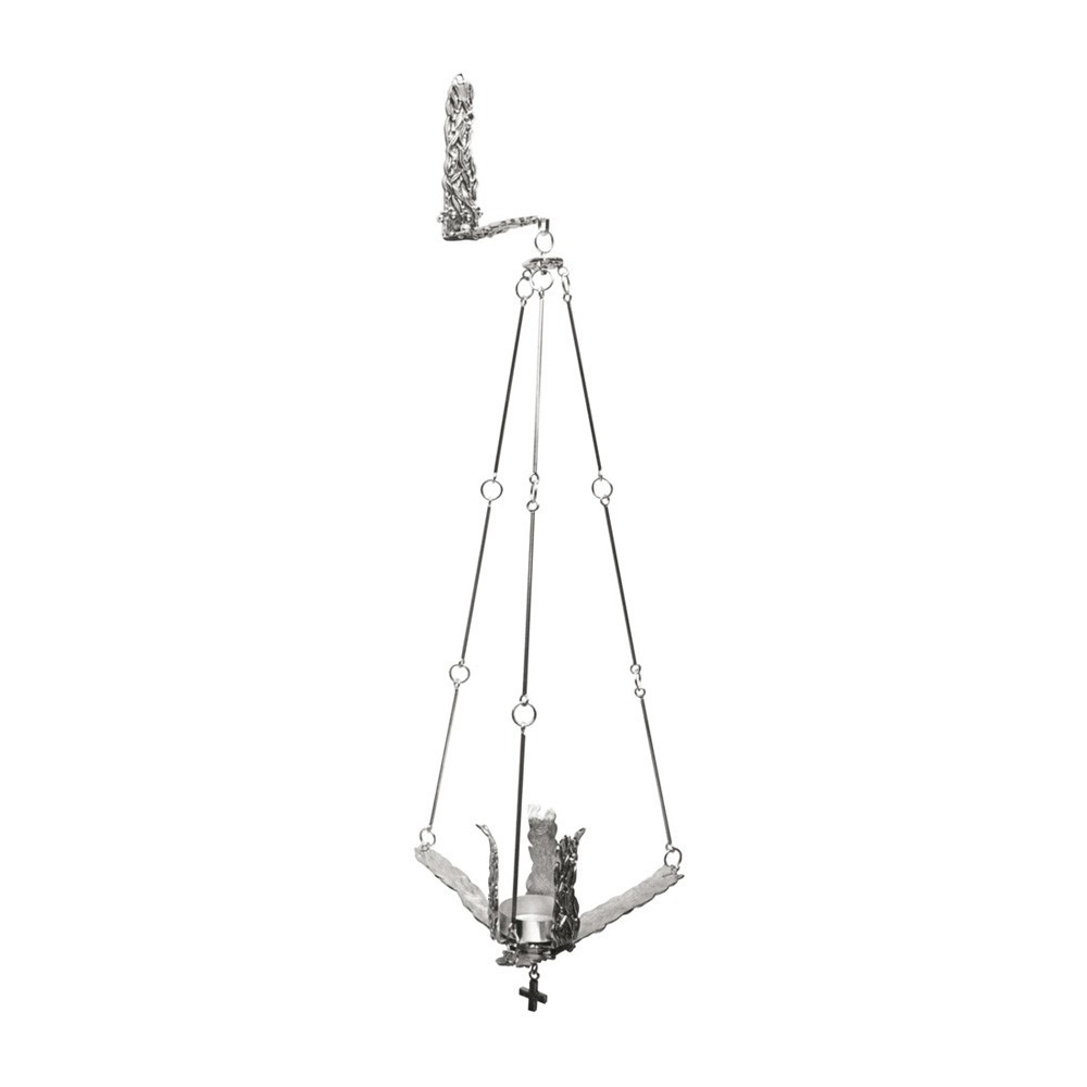 Sanctuary lamp to hang on the wall. This lamp is suitable to hold Sanctuary candles and ruby glasses. It's provided with chains and wall fitting. Embellished with olive-shaped decorations.