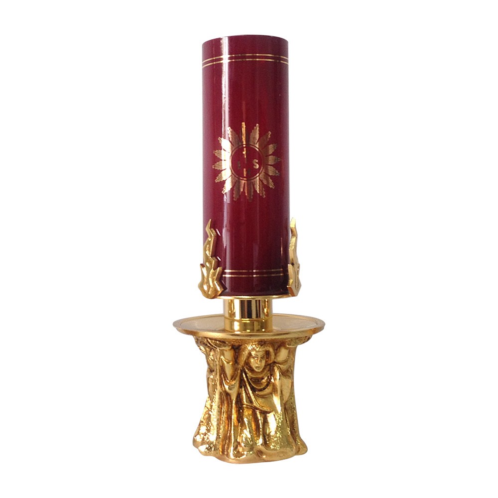 Sanctuary lamp made of golden brass. The lamp is 20 cm tall and is suitable to hold a glass with a maximum diameter of 8 cm.