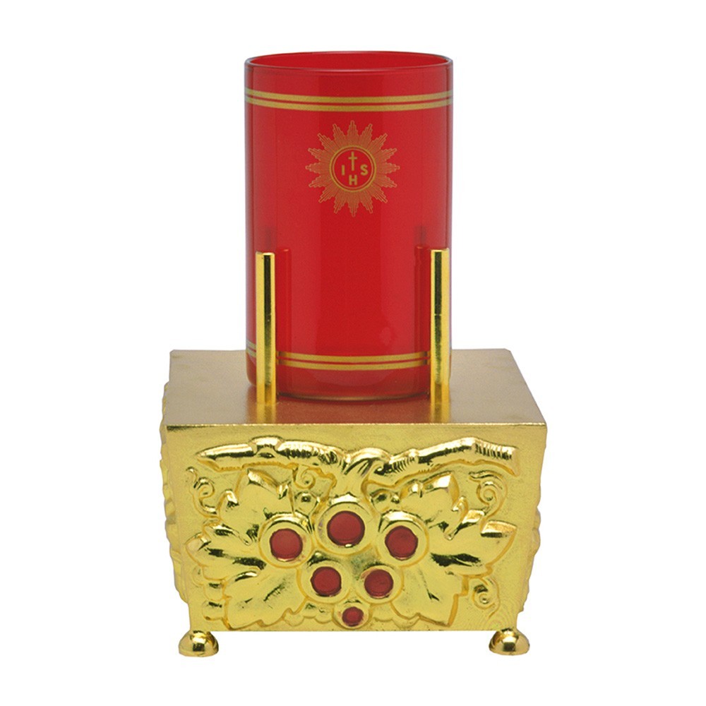 This altar lamp is made of bronze with gold finish and is finely decorated by a red glaze and a bunch of grapes.