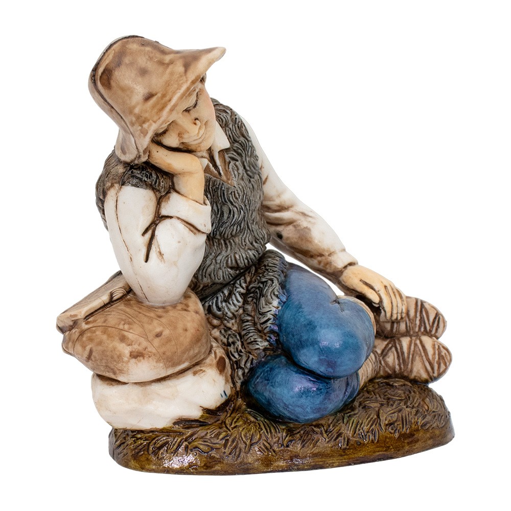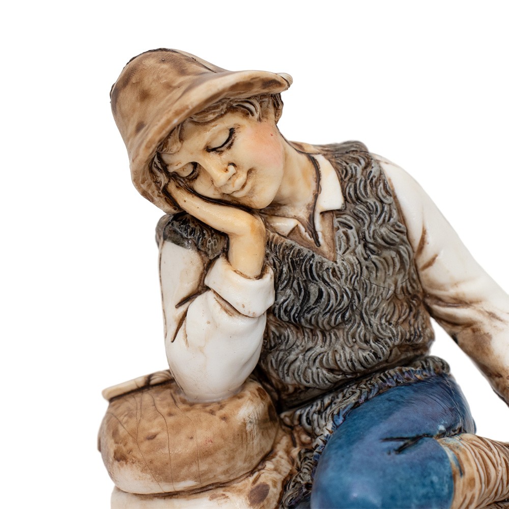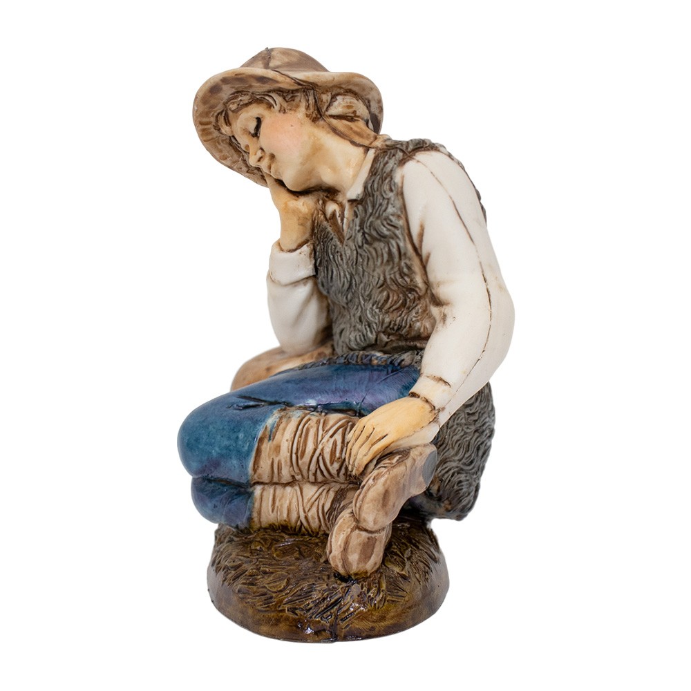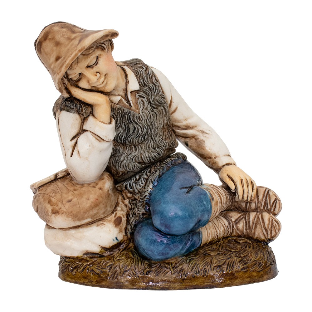 Man Sleeping, Landi Nativity Scene 12 cm. This figurine depicts a man wearing a hat, sleeping leaning against a stone. Made in Italy.
