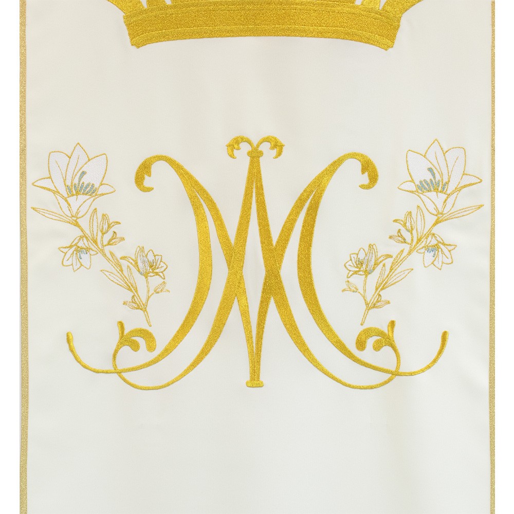 Finely embroidered by machine with excellent quality yarn. The embroidery depicts the Marian symbol topped by the crown, surrounded by lilies and enriched with golden fringes.