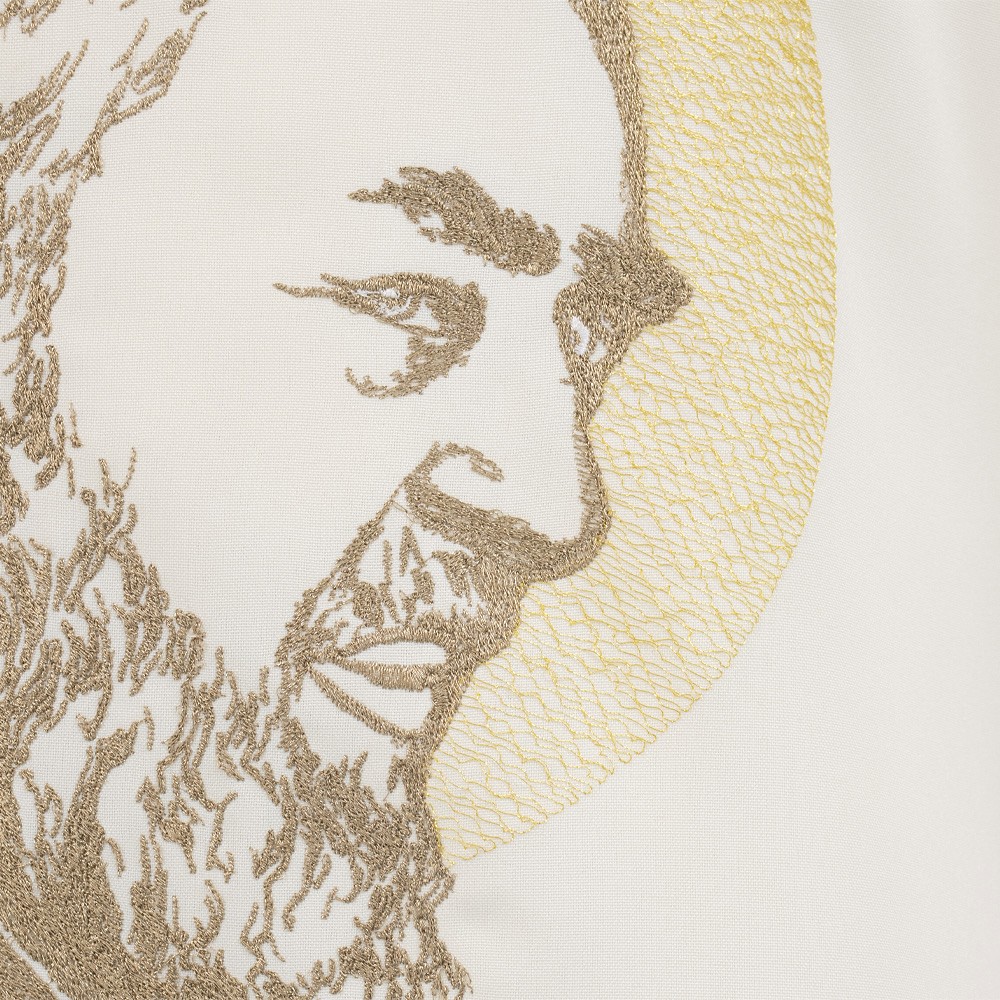 Religious lectern cover with embroidered image of Saint Pio’s face.