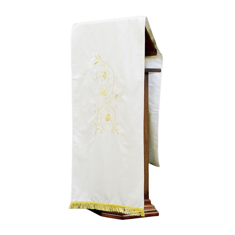 Lectern cover made of satin fabric with golden thread embroidery (two color tones) made using the multi-head embroidery machine. The two extremities are adorned by fringes. Excellent value for money. Elegant product suitable for the decoration of the lectern and the Church. Made in Italy!