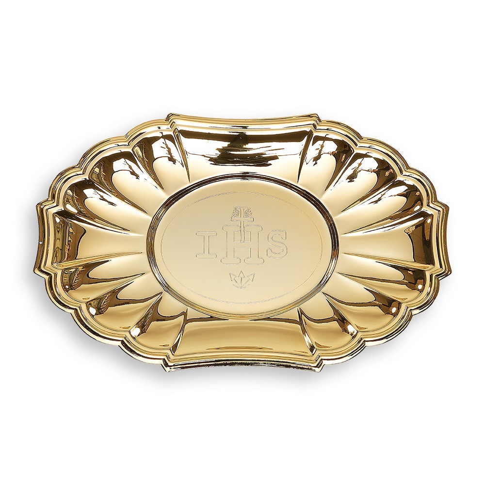 Golden brass plate for the distribution of the Communion. The tray has an oval shape and a Baroque style, with IHS engraving in the central part. 100% made in Italy.