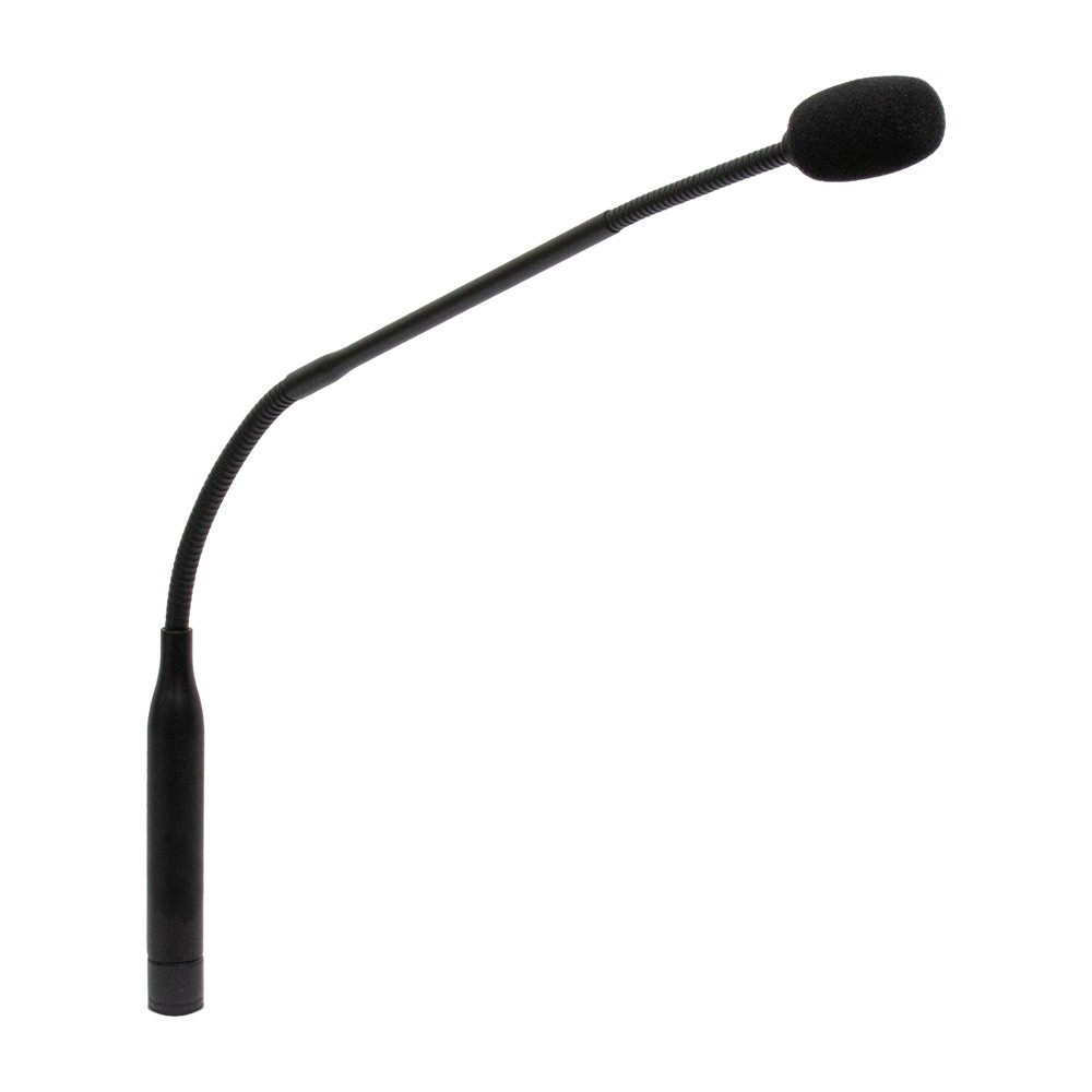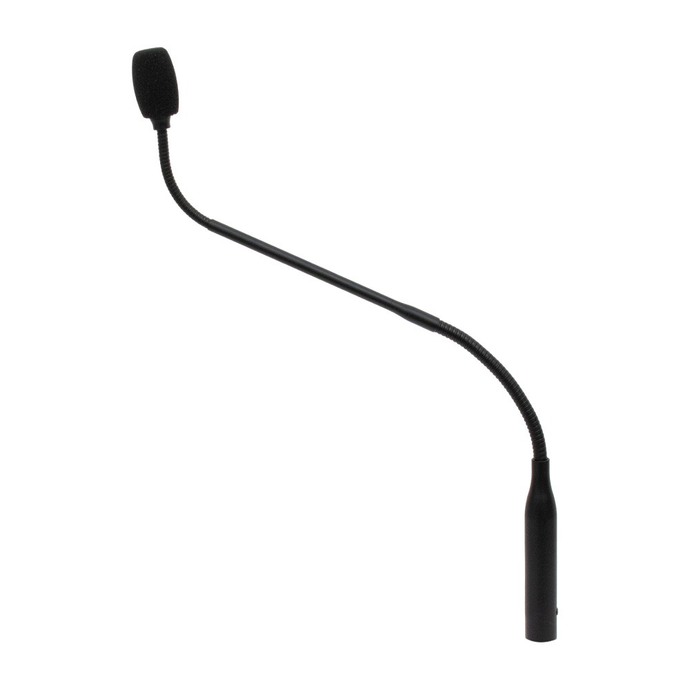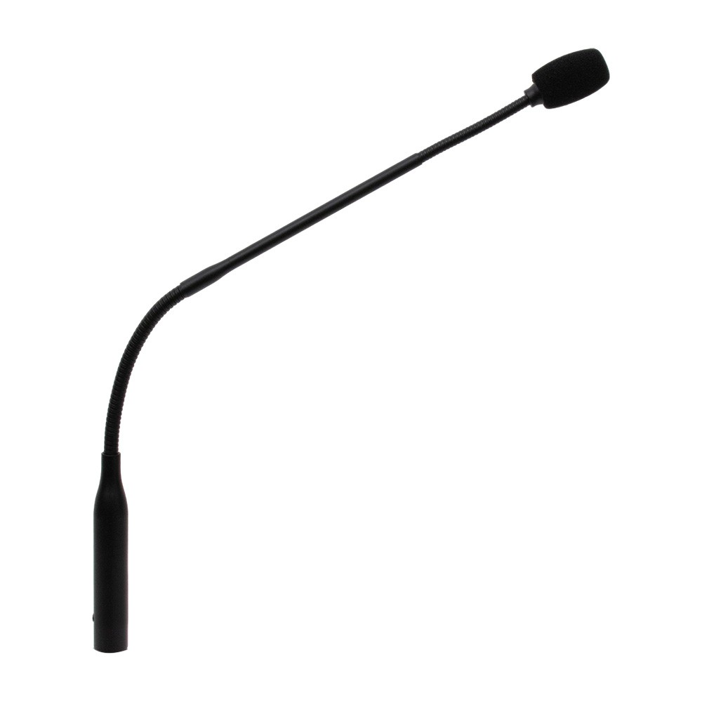 Black gooseneck microphone designed for high quality general amplification, professional recording and radio broadcasting, places of worship and multimedia rooms; they are multifunctional and make the voice clear and intelligible.