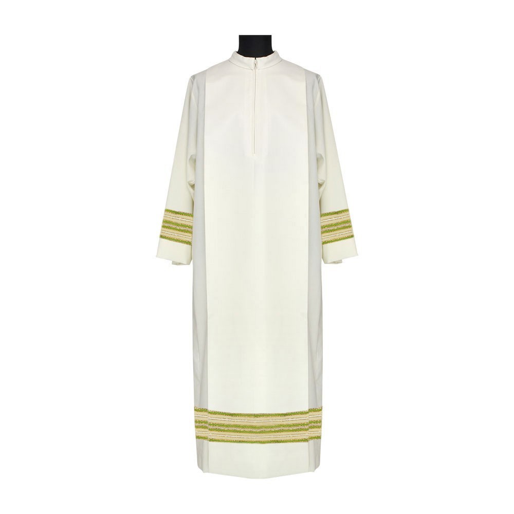 Liturgical alb of ivory color made of light polyester and wool fabric blend. Decorated with green partition. Central zipper on the front and two folds on both sides of the alb.