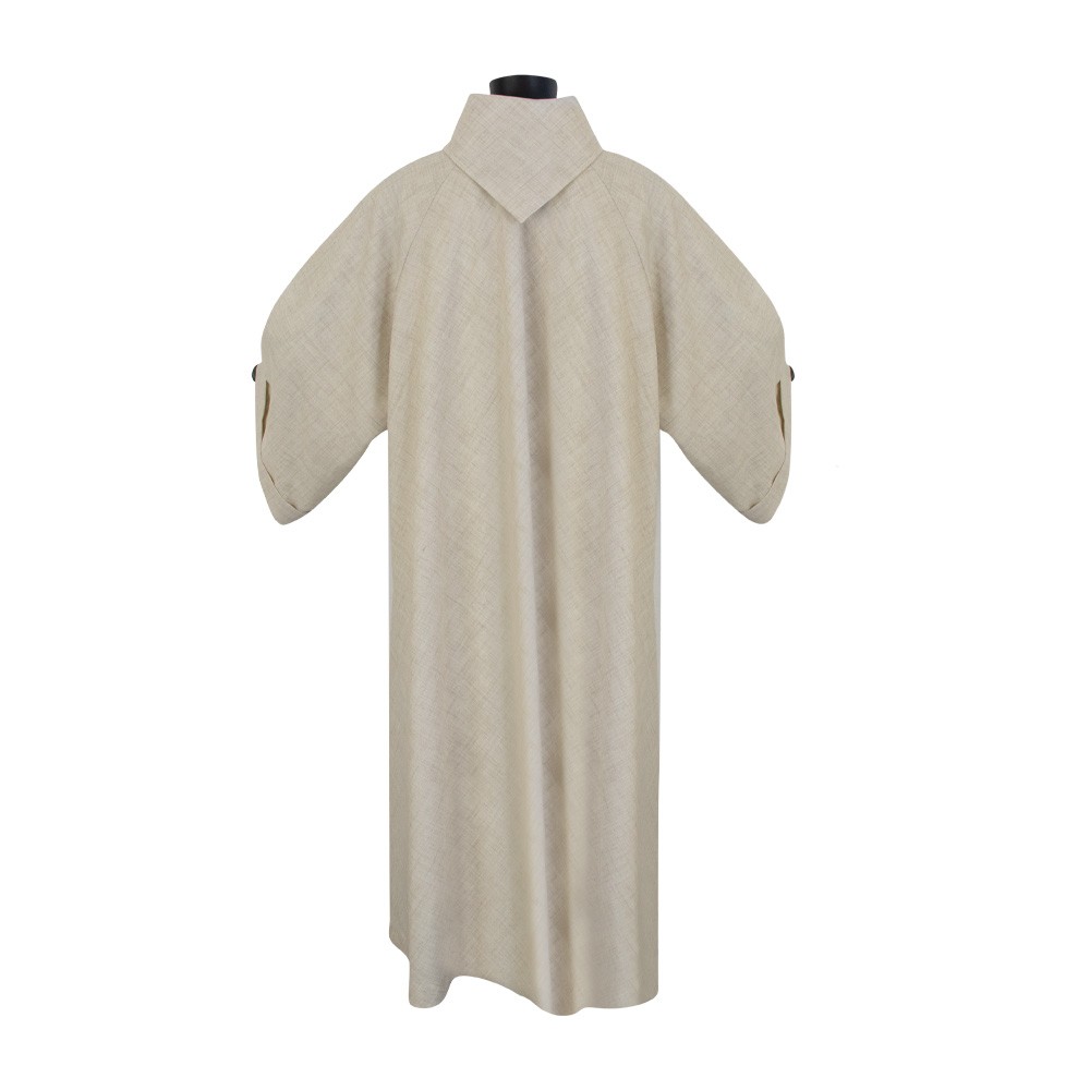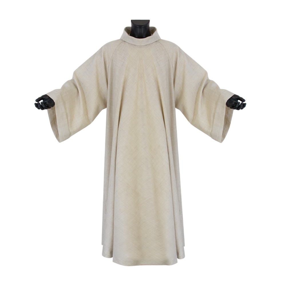 This liturgical alb features a flared cocolla style with a side opening that functions as a pocket.