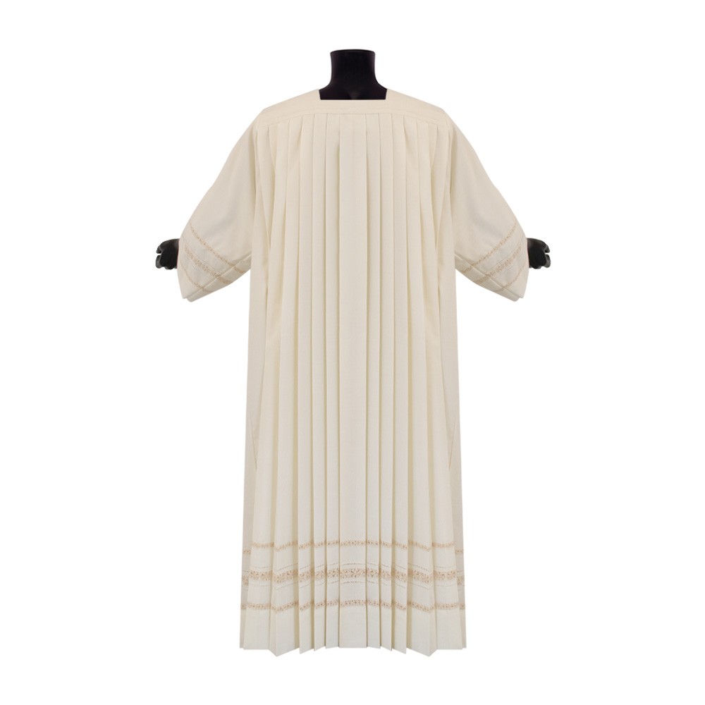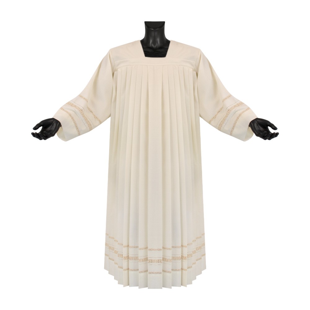 The alb is made of an ultra-lightweight wool and polyester blend fabric.