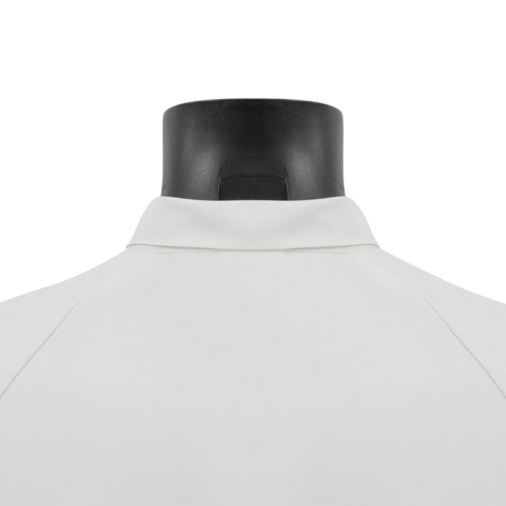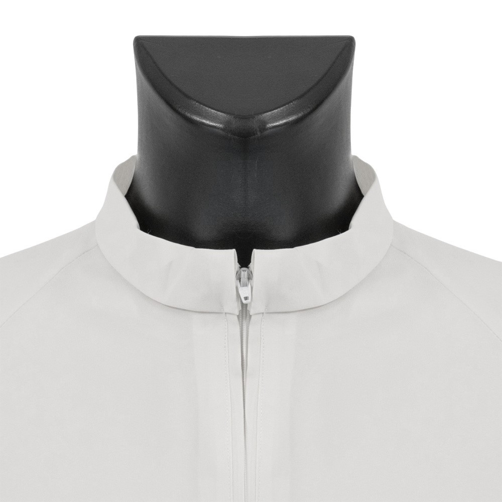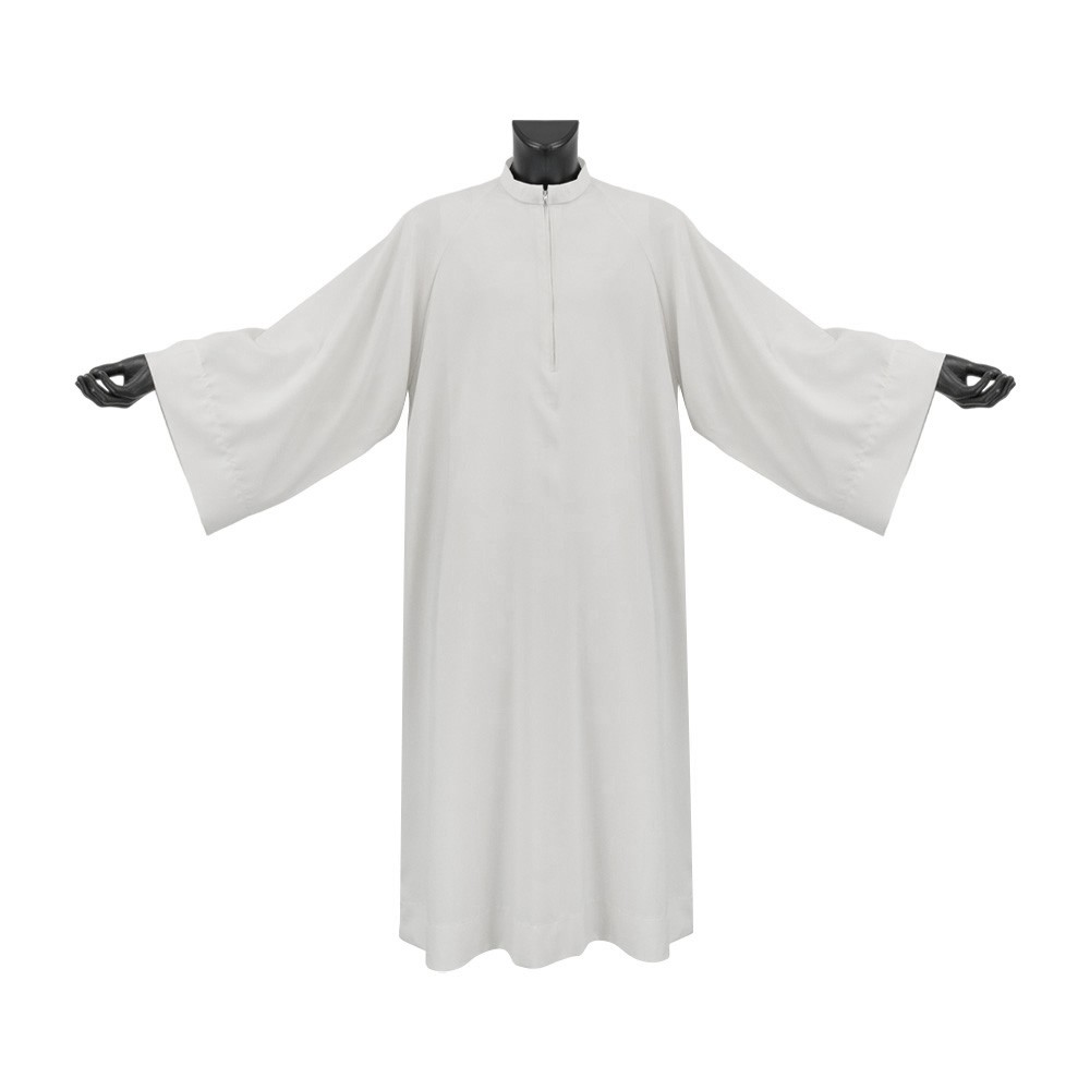 Well-finished celebrant alb with chest zipper, plain design without pleats and raglan sleeves.