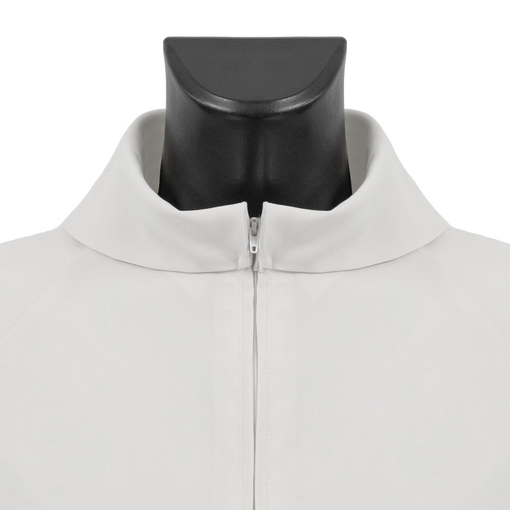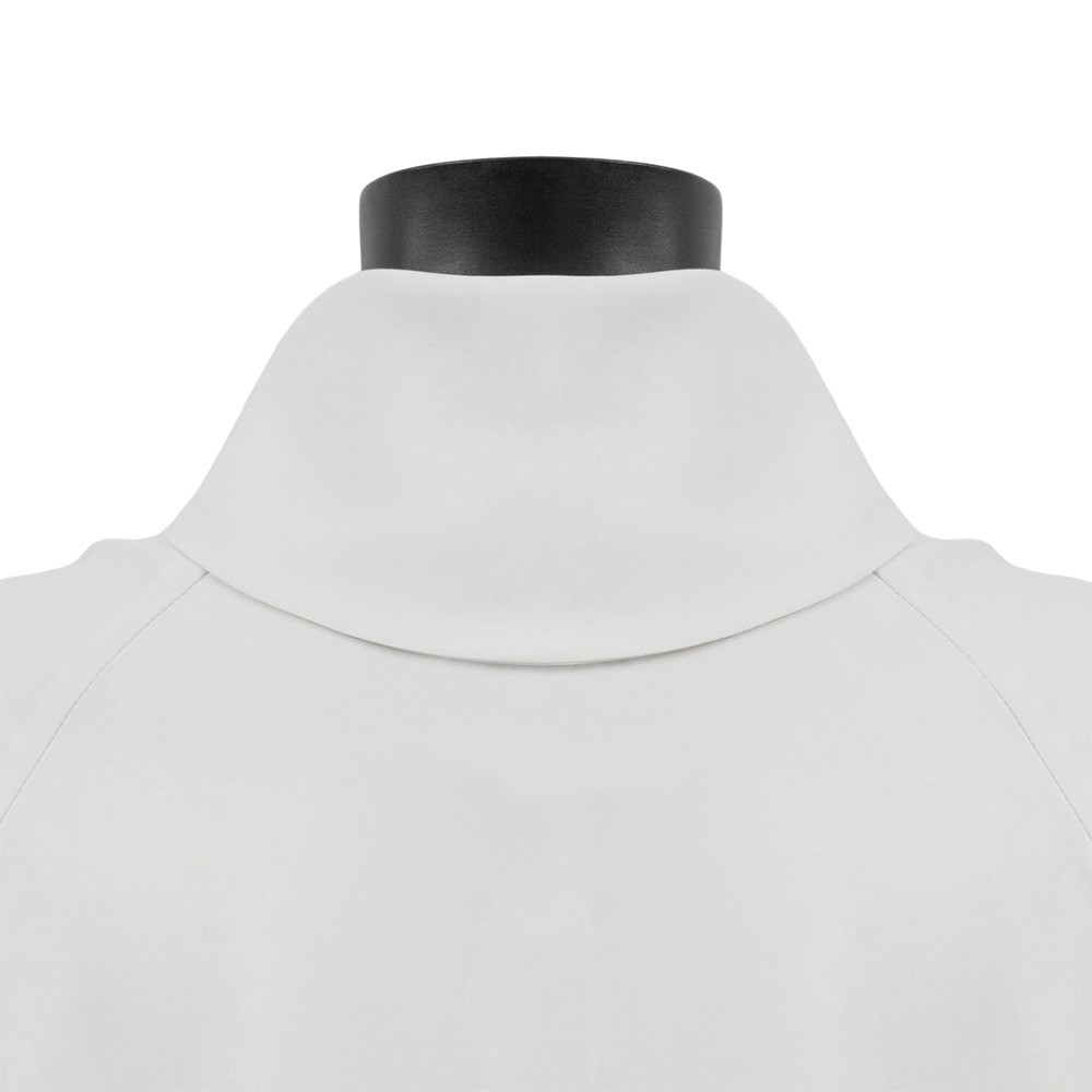 White priest alb, well finished, with chest zipper, model without pleats, raglan sleeves, and faux hood.