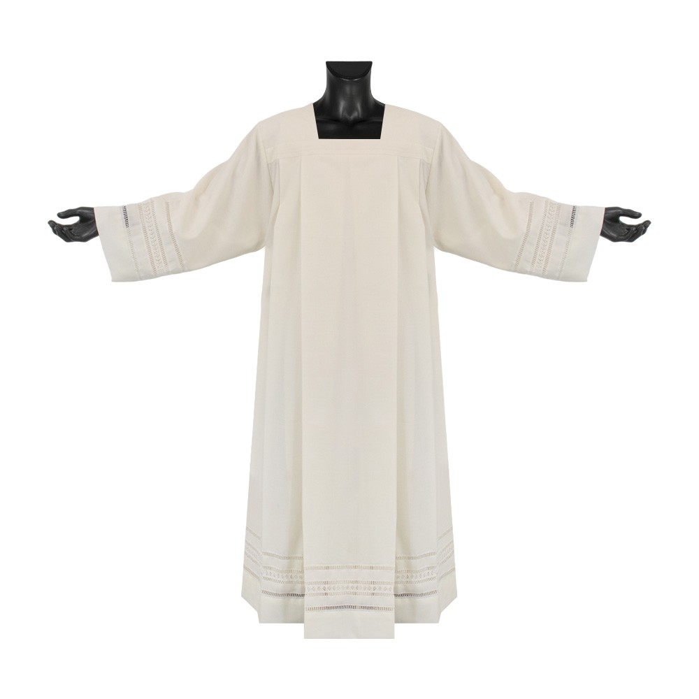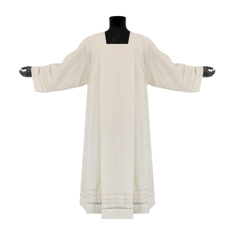 Priest alb made from breathable wool and polyester, making the garment lightweight and easy to wash and iron.